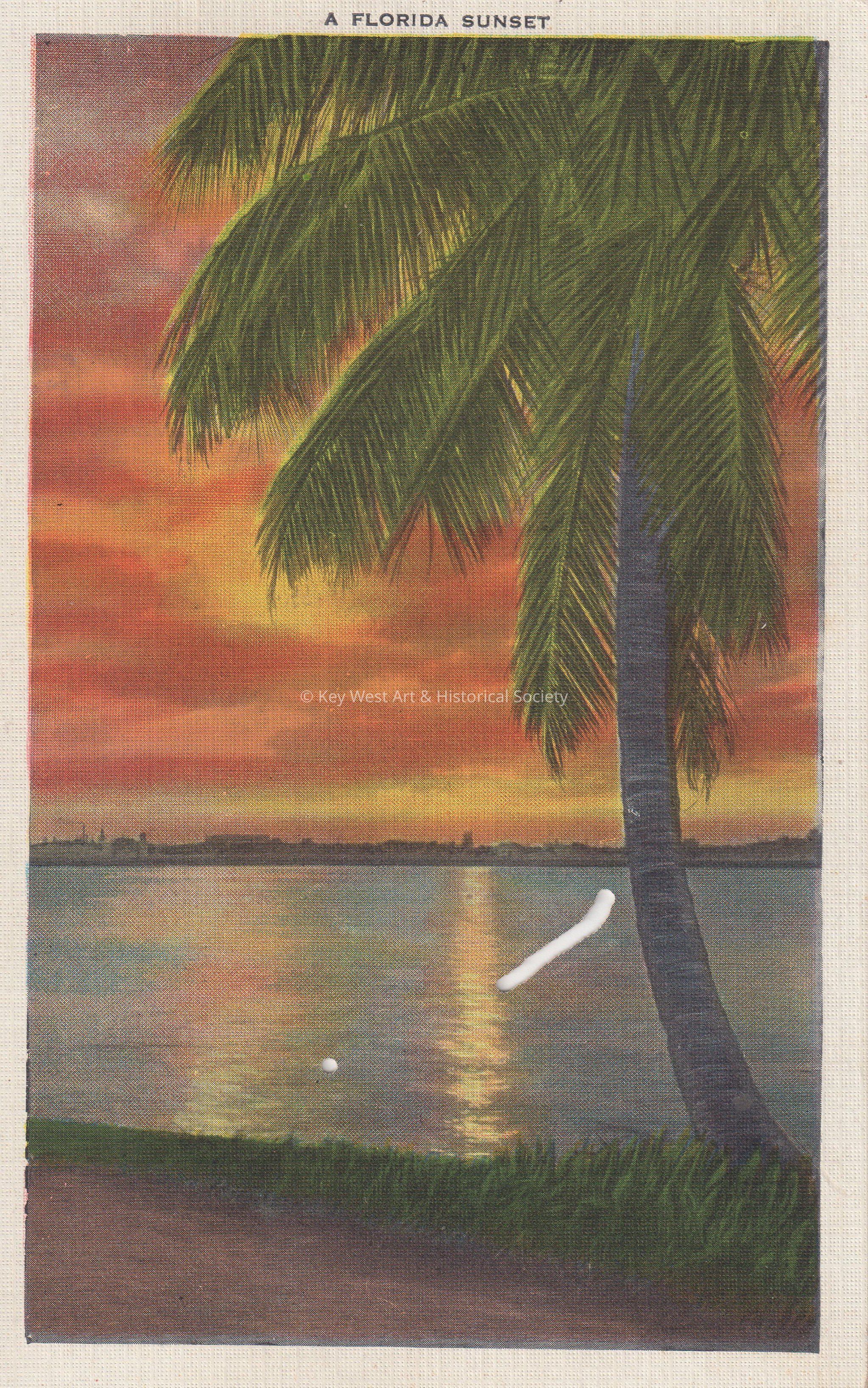 Postcard depicting a palm tree and sunset over the ocean. The caption reads, ‘A Florida Sunset.’ The description on the verso reads, ‘Delightful, Charming Florida – “Sweet-scented Oleanders line the way adding their fragrance to a perfect day. Blossoms unfolded to southern sun, their varied colorings divinely done. Magnolia blossoms—fair to see join in the radiant galaxy of fragrance and color in gorgeous frieze bowing obeisance before the breeze.”’Collection