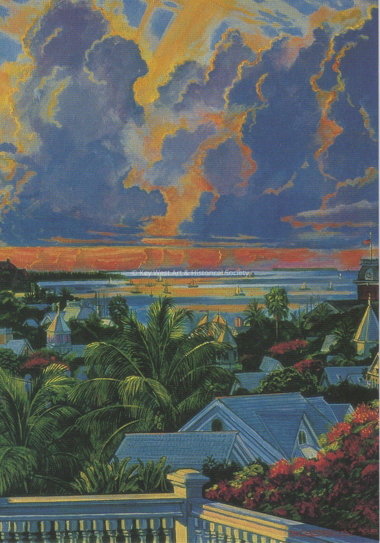 Postcard depicting a cloudy sunset over water. The description on the verso reads, ‘Richard Peter Matson “Sunset over the Harbor from Casa Antigua, Key West.” 20 by 16 acrylic on canvas.’Collection
