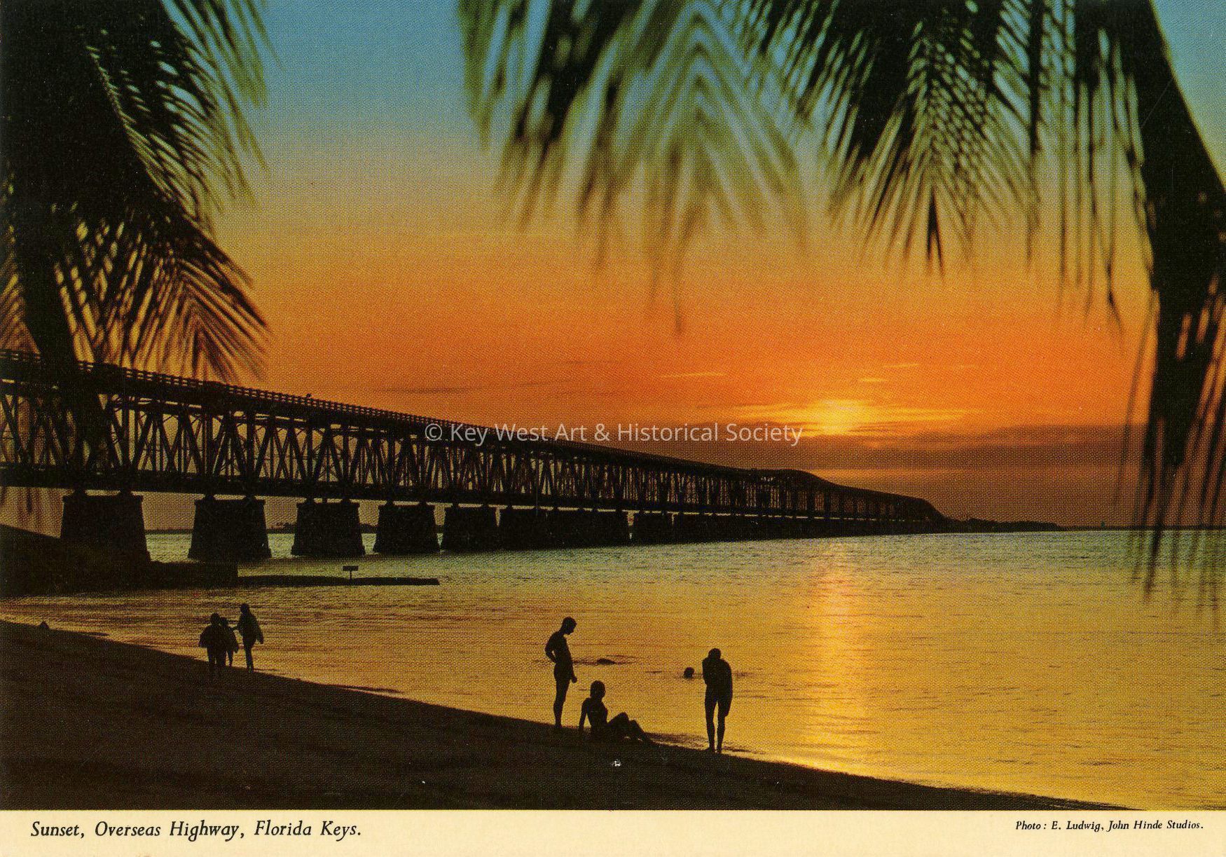 Postcard depicting people swimming at Bahia Honda State Park with the bridge in the background during sunset. Notation on verso, 'The highest bridge in the Overseas Highway system rising 65 feet over the water. All of these bridges are built on what was formerly the road bed for the Florida East Coast Railway, which connected Key West with the mainland and was completed in the early 1900s. The Labor Day hurricane of 1935 destroyed the railroad, and the road bed was offered to the state for use as a highway, which was completed in 1942.'Subject Place