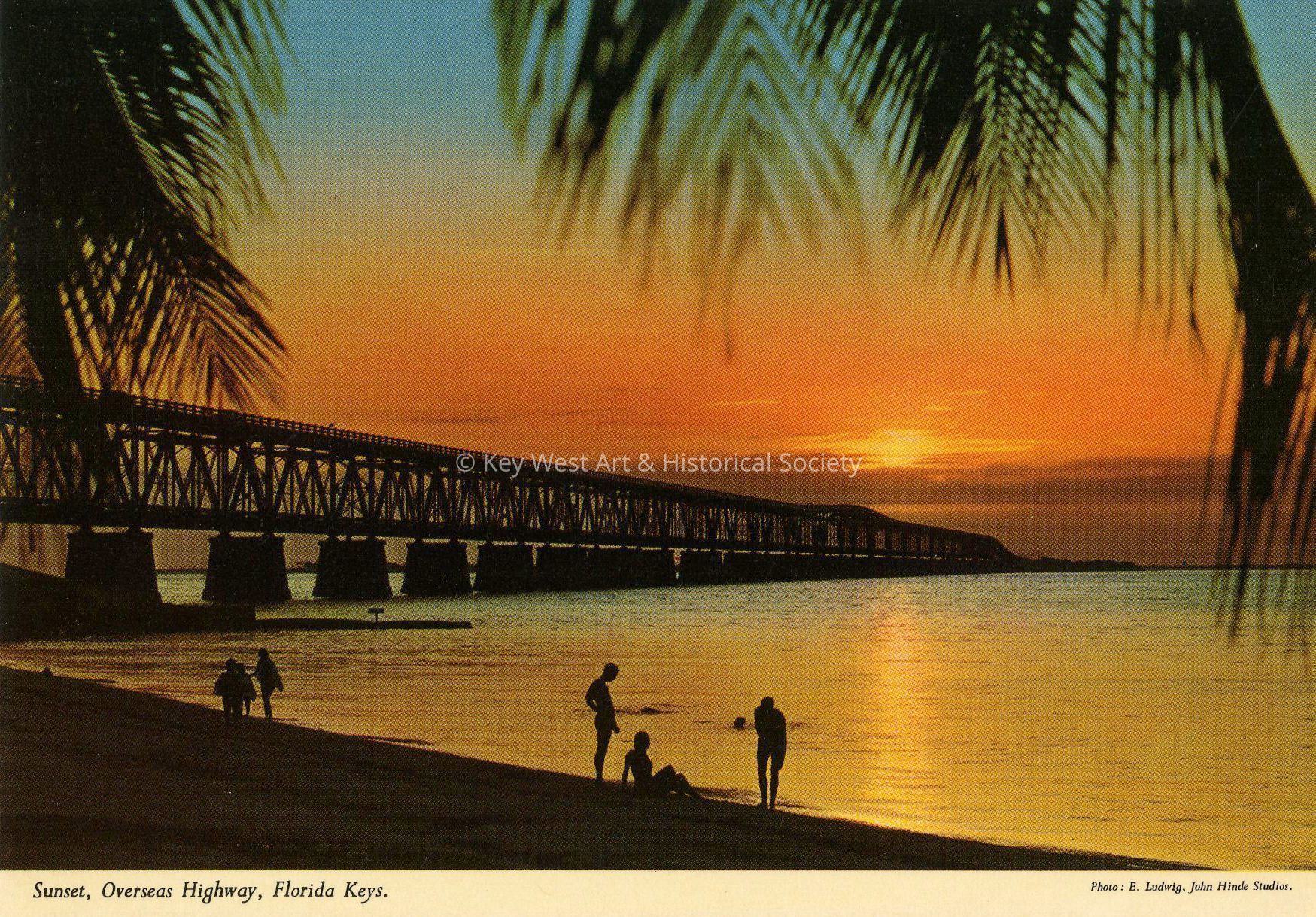 Postcard depicting people swimming at Bahia Honda State Park with the bridge in the background during sunset. Notation on verso, 'The highest bridge in the Overseas Highway system rising 65 feet over the water. All of these bridges are built on what was formerly the road bed for the Florida East Coast Railway, which connected Key West with the mainland and was completed in the early 1900s. The Labor Day hurricane of 1935 destroyed the railroad, and the road bed was offered to the state for use as a highway, which was completed in 1942.'Subject Place