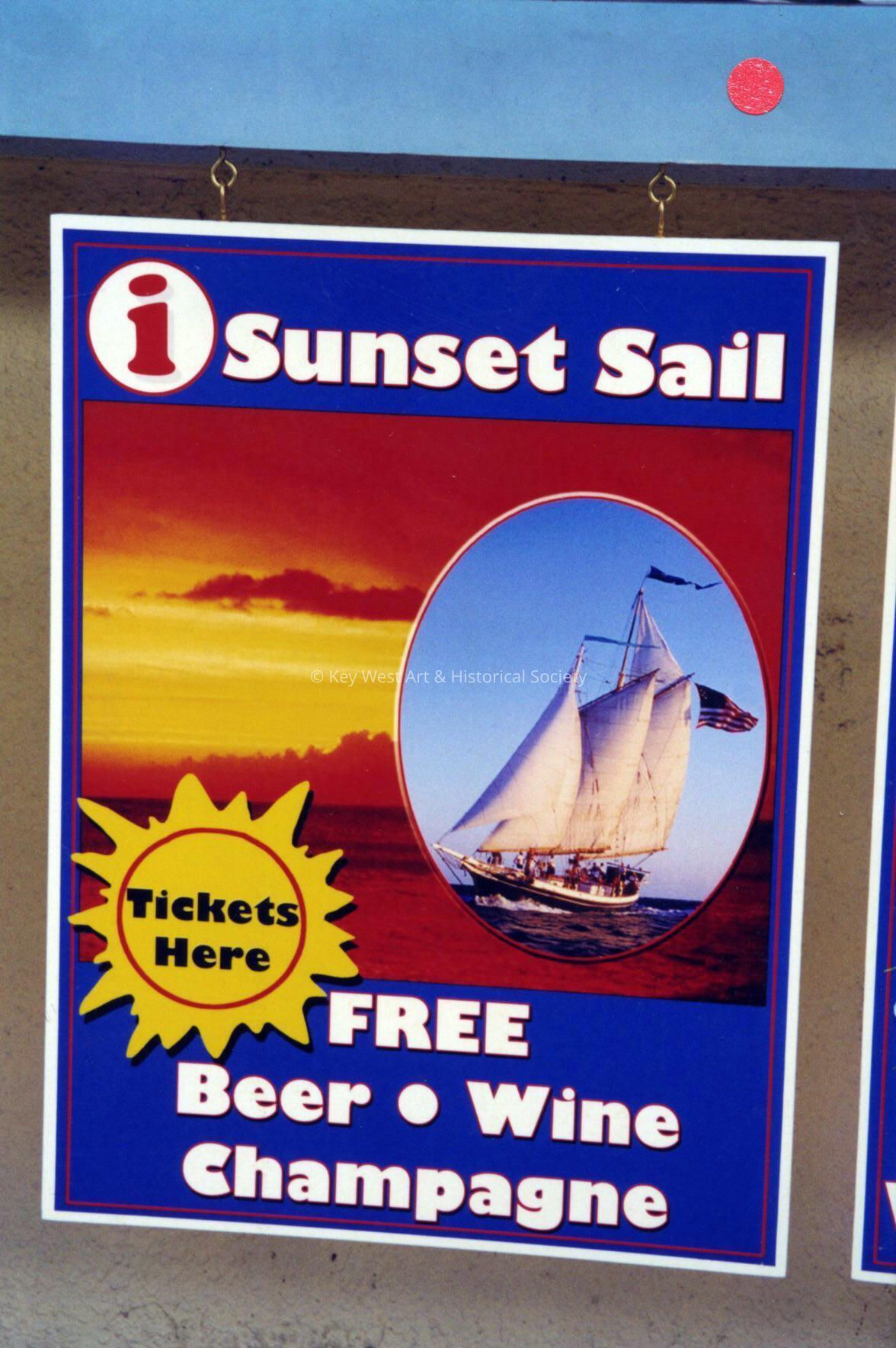 Color photograph taken by historian James M. Goode of the Sunset Sail sign at the corner of Truman Avenue and Duval Street during a trip to Key West in August 2001. Printed from Roll 15.