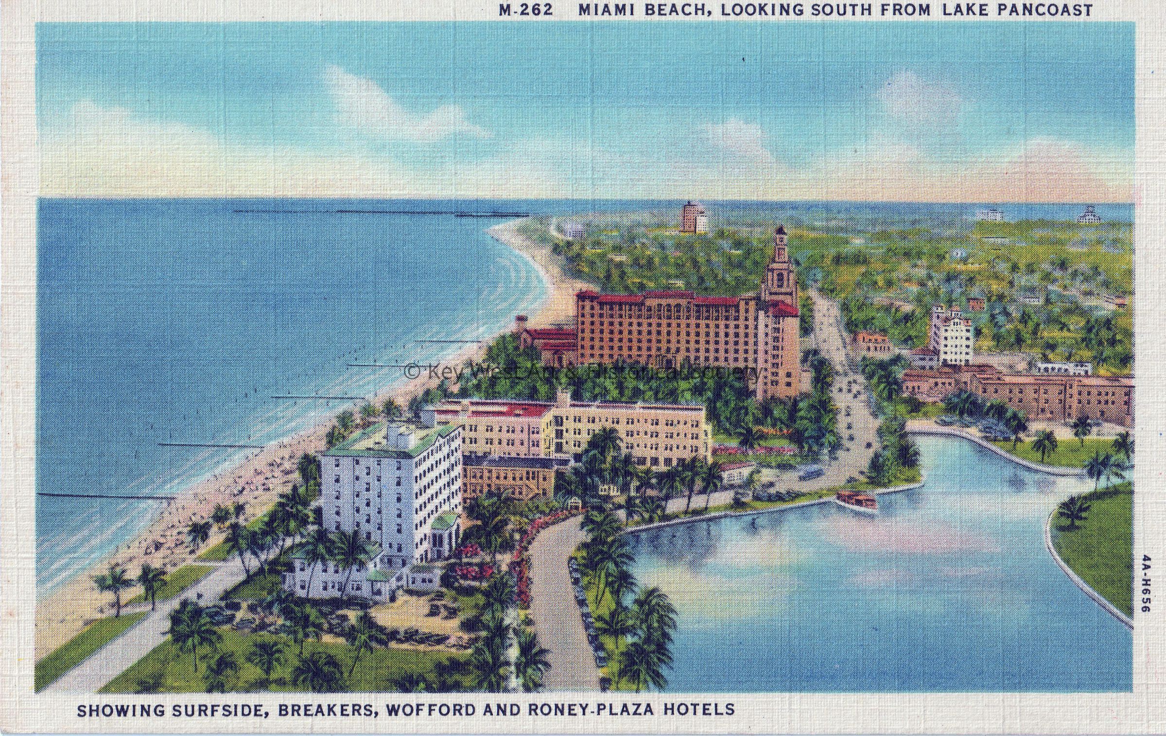 Postcard depicting large hotels on the beachfront. The caption reads, ‘Miami Beach, Looking South from Lake Pancoast. Showing Surfside, Breakers, Wofford and Roney Plaza Hotels.’Collection