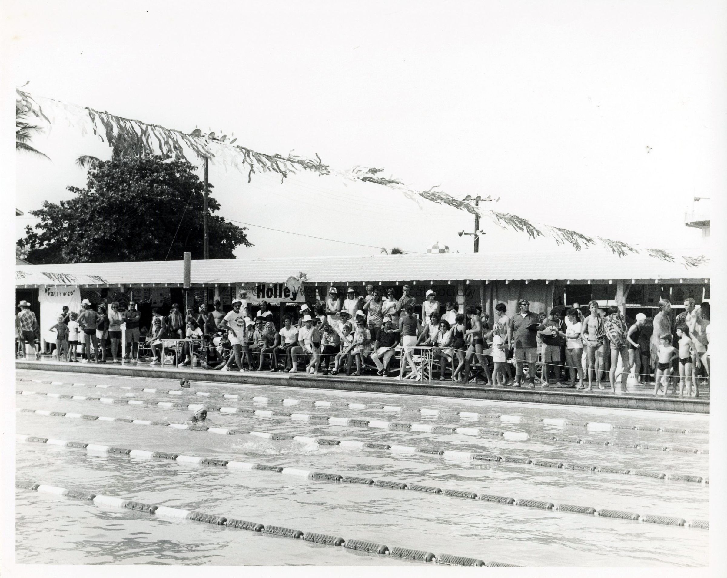 Black and white photograph of a swim meet held at a Naval Station Key West pool, possibly on Trumbo.
