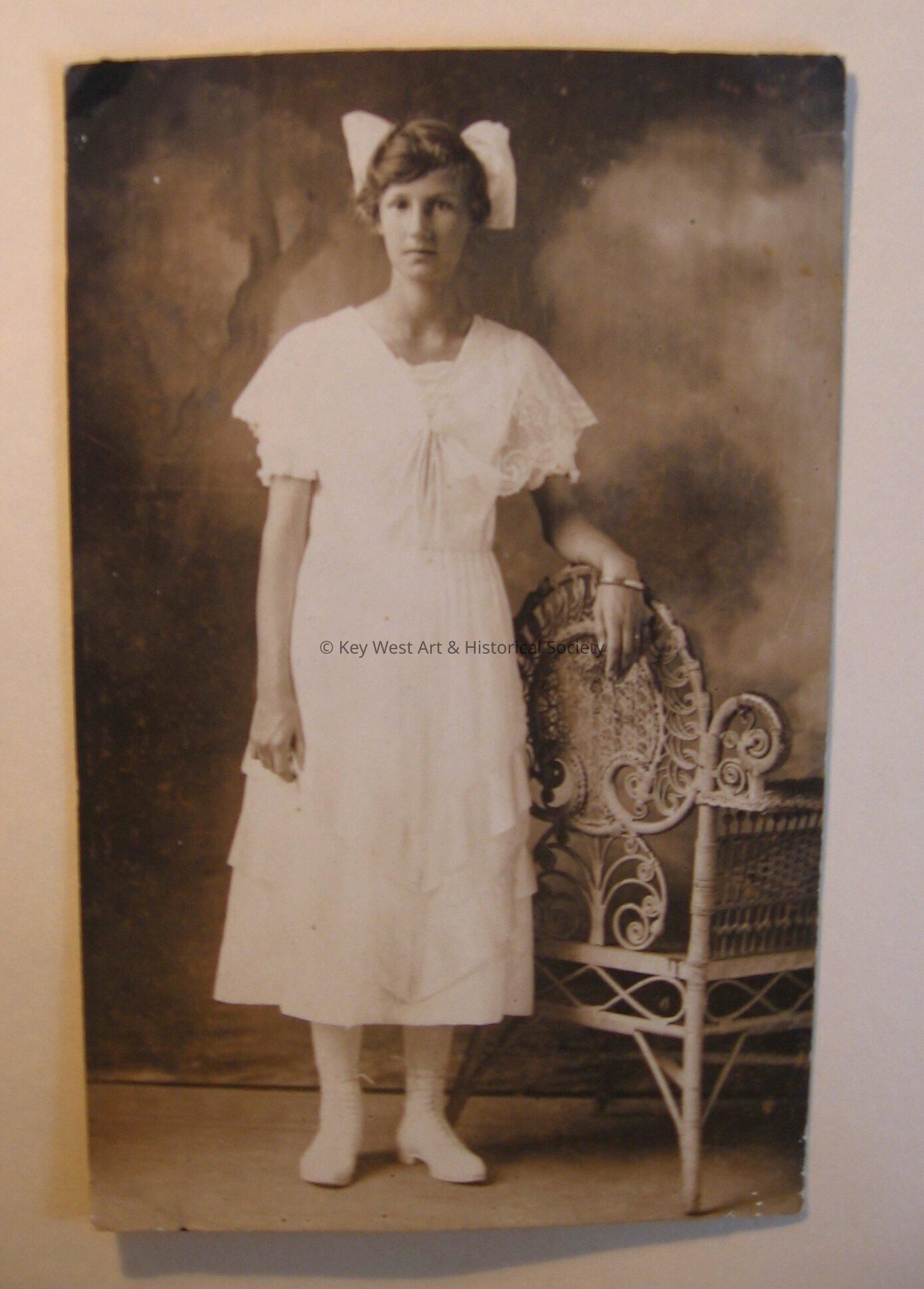 Photograph postcard of Sybil Sawyer standing next to a chair in a white dress with a big bow in her hair.