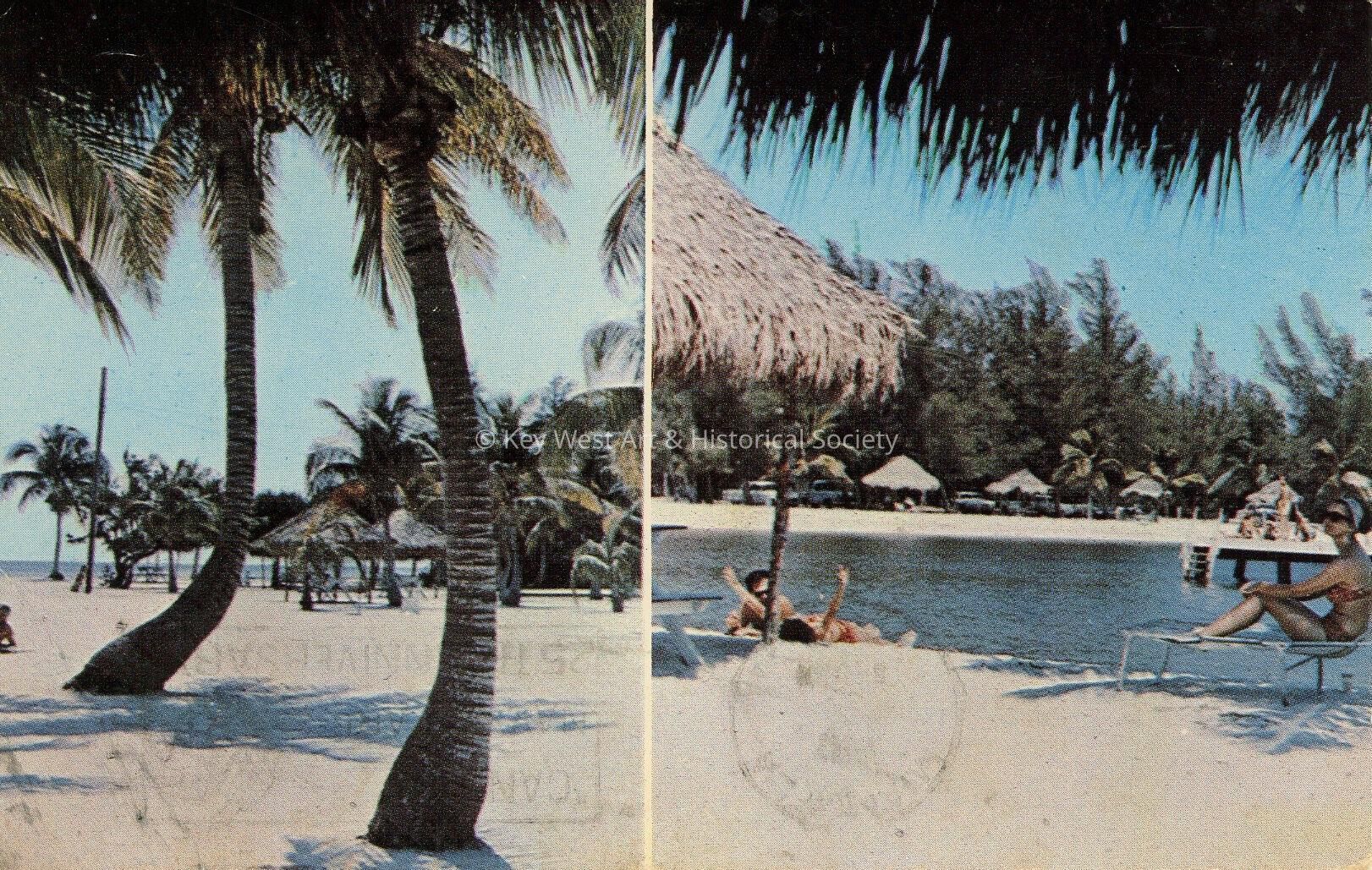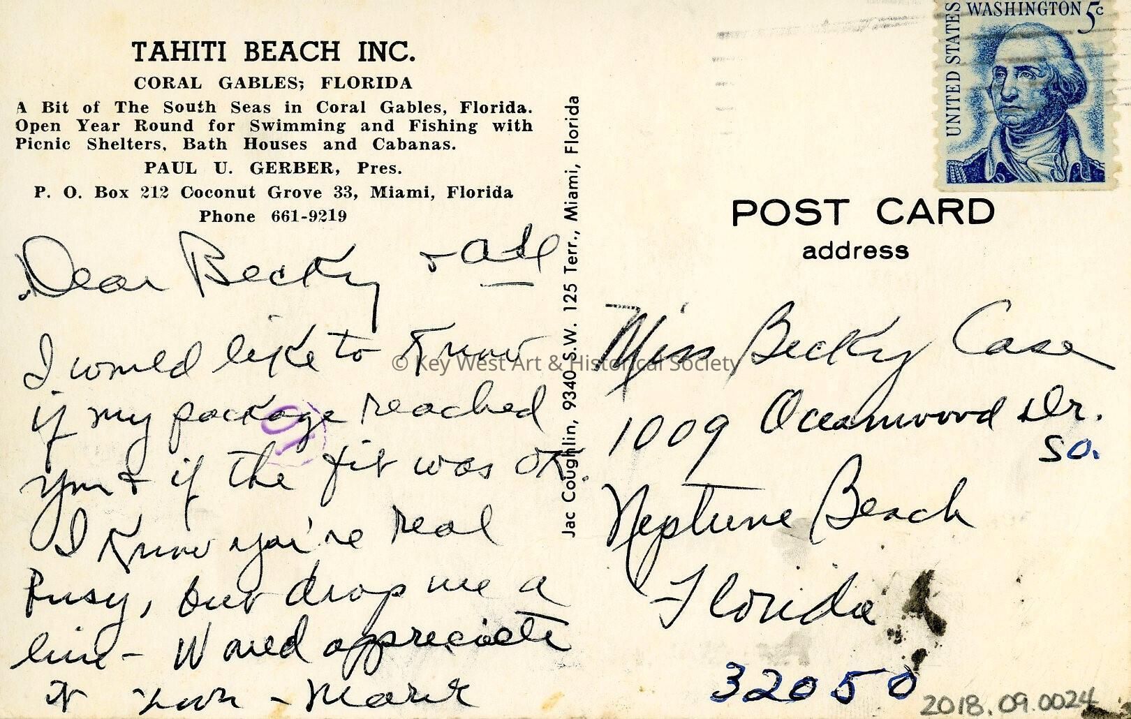 Postcard depicting Tahiti Beach in Coral Gables. Description on verso reads, 'Tahiti Beach Inc., Coral Gables; Florida. A bit of The South Seas in Coral Gables, Florida. Open year round for swimming and fishing with picnic shelters. Bath houses and cabanas.' Message on verso reads, 'Dear Becky & all, I would like to know if my package reached you & if the fit was OK. I know you're real busy, but drop me a line - would appreciate it. Love, Mark.'Subject Place