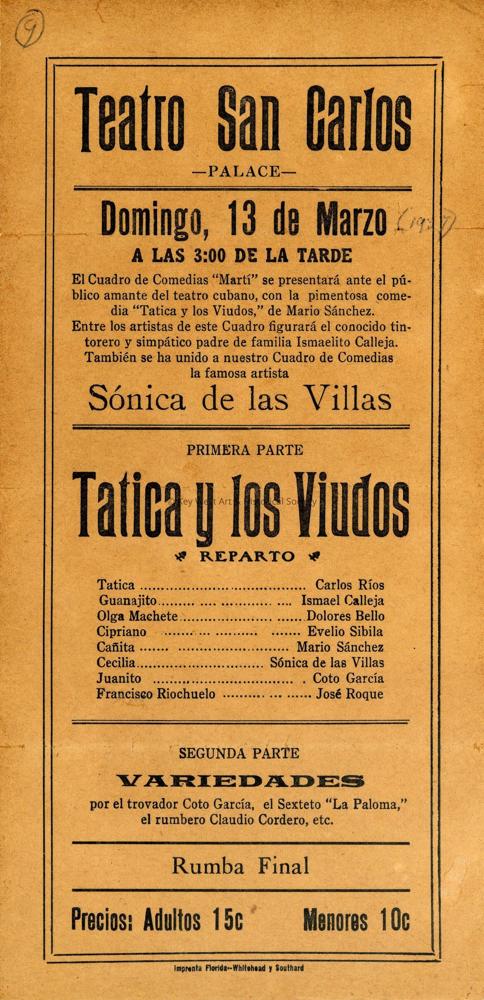 Handbill written in Spanish advertising a variety show at the San Carlos Theatre dated March 13, 1937. The first play, titled 'Tatica y los Viudos', was written by Mario Sanchez who also plays the character Canita.Collection