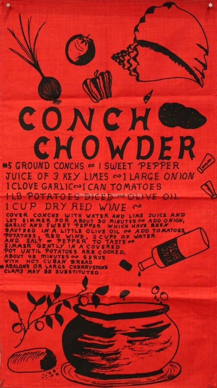 A cotton tea towel with text detailing a recipe for the popular Bahamian dish conch chowder. The towel was designed by Peter Pell for Key West Hand Print Fabrics.