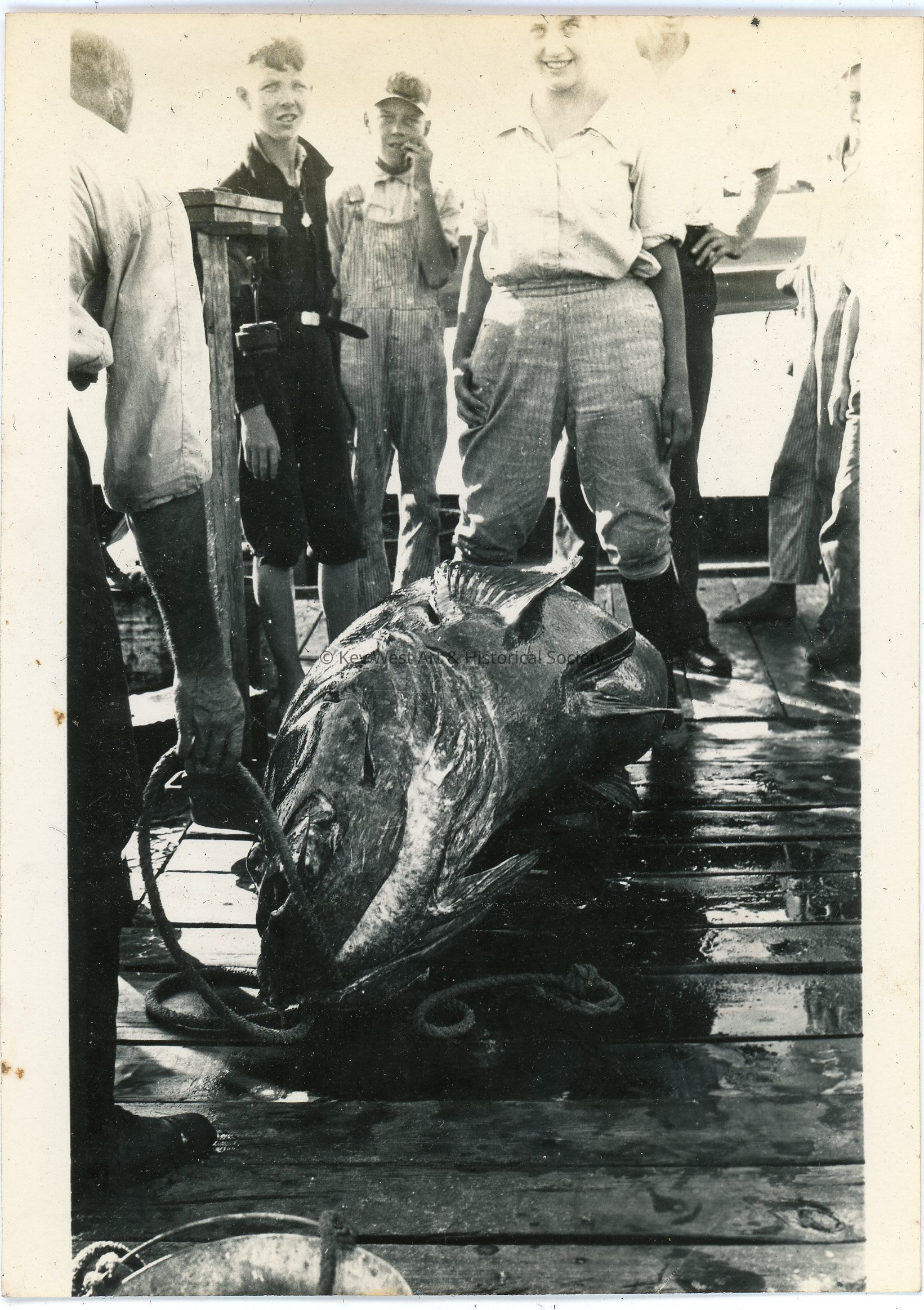Black and white photograph of a group of young people standing behind a large fish, likely a type of grouper. The photo was part of a photograph album began by Victor H. Baker in 1940.