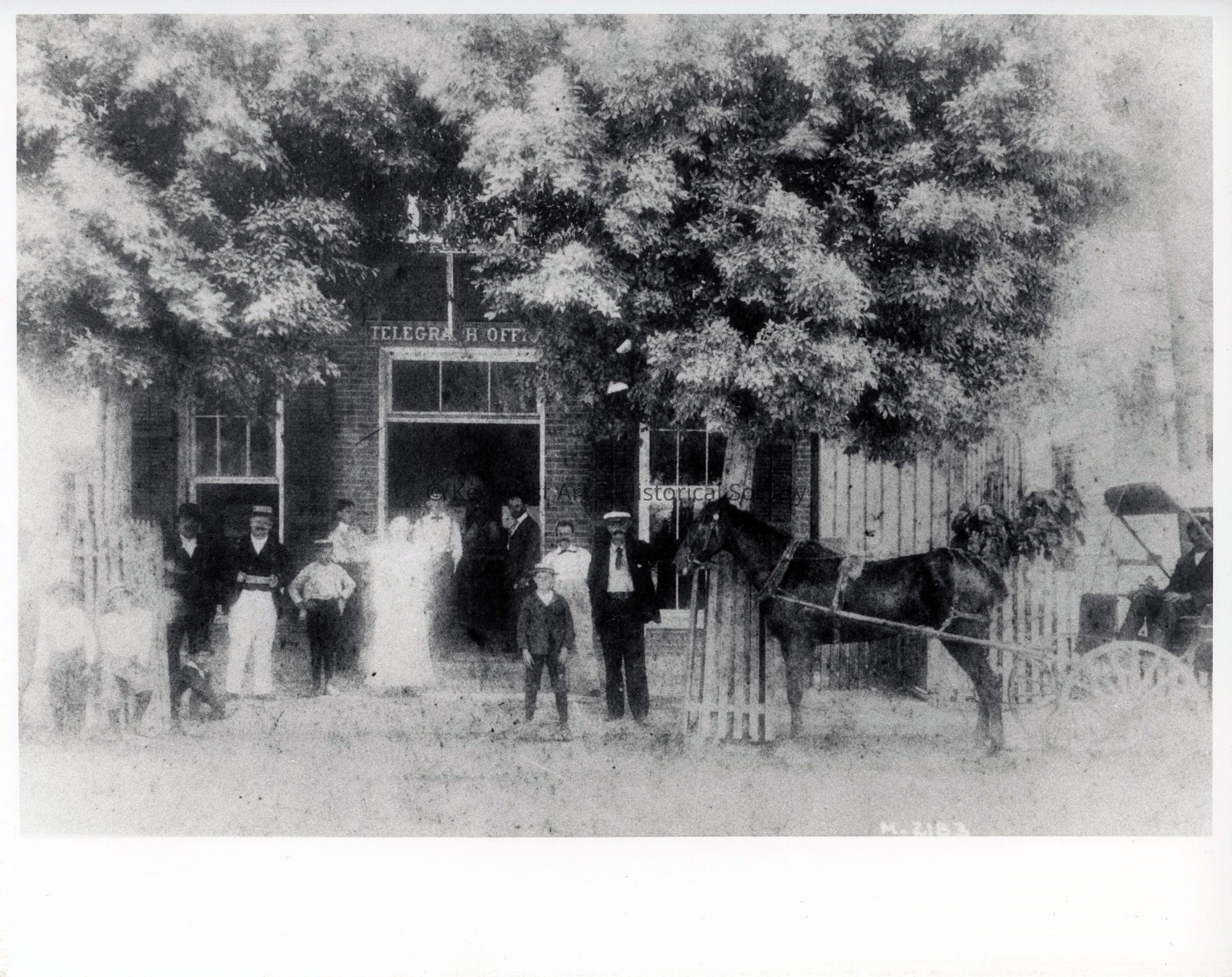 Black and white photograph of employees and a horse and buggy outside the Telegraph Office at 416 Greene Street.