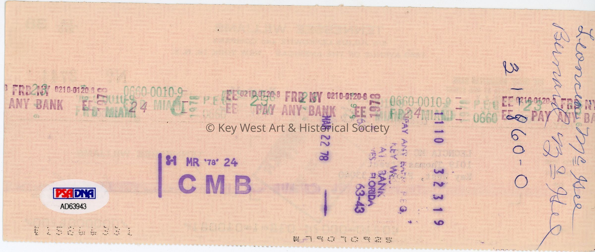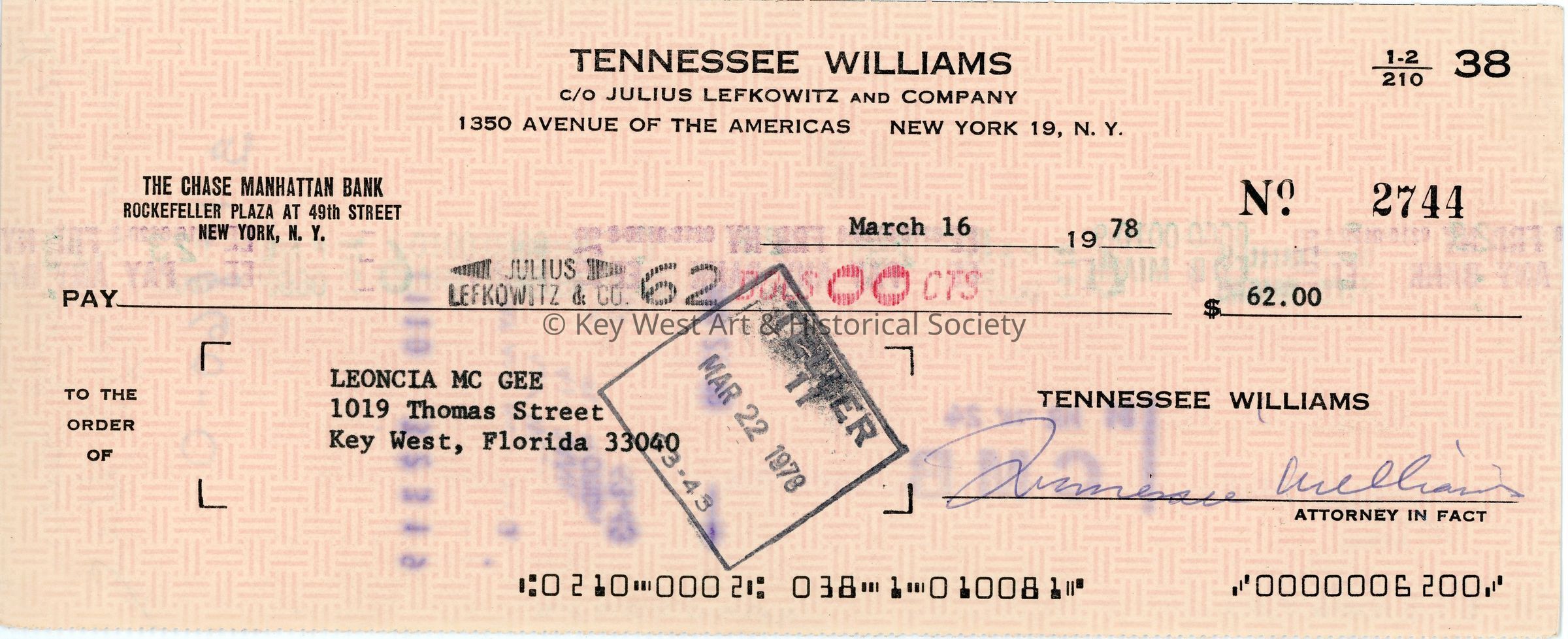Bank check signed by Tennessee Williams and endorsed by his Key West housekeeper Leoncia McGee and Bernard McGee. The back face of the check has an endorsement signature and several stamps.