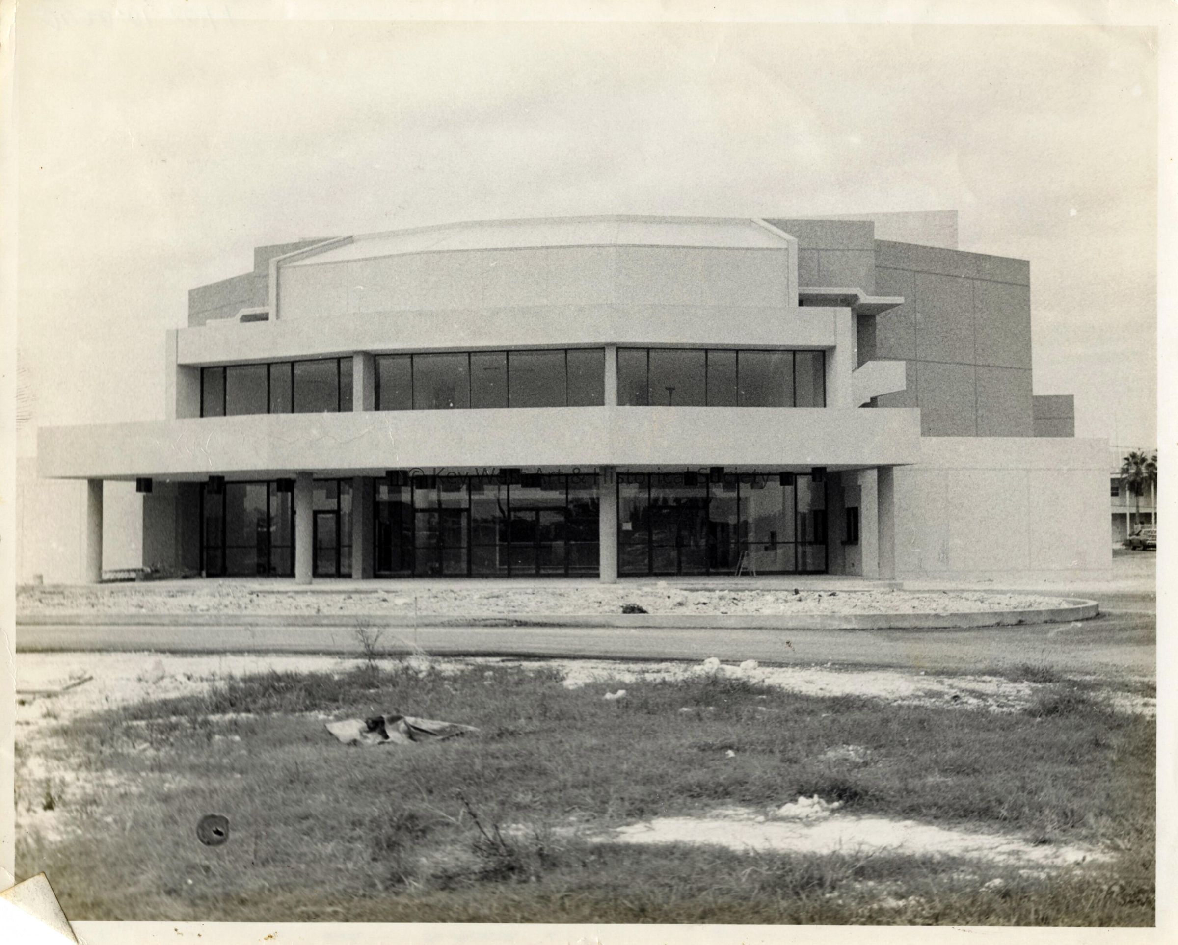 Black and white photograph of the Tennessee Williams Fine Arts Center, also known as the Tennessee Williams Theatre.
