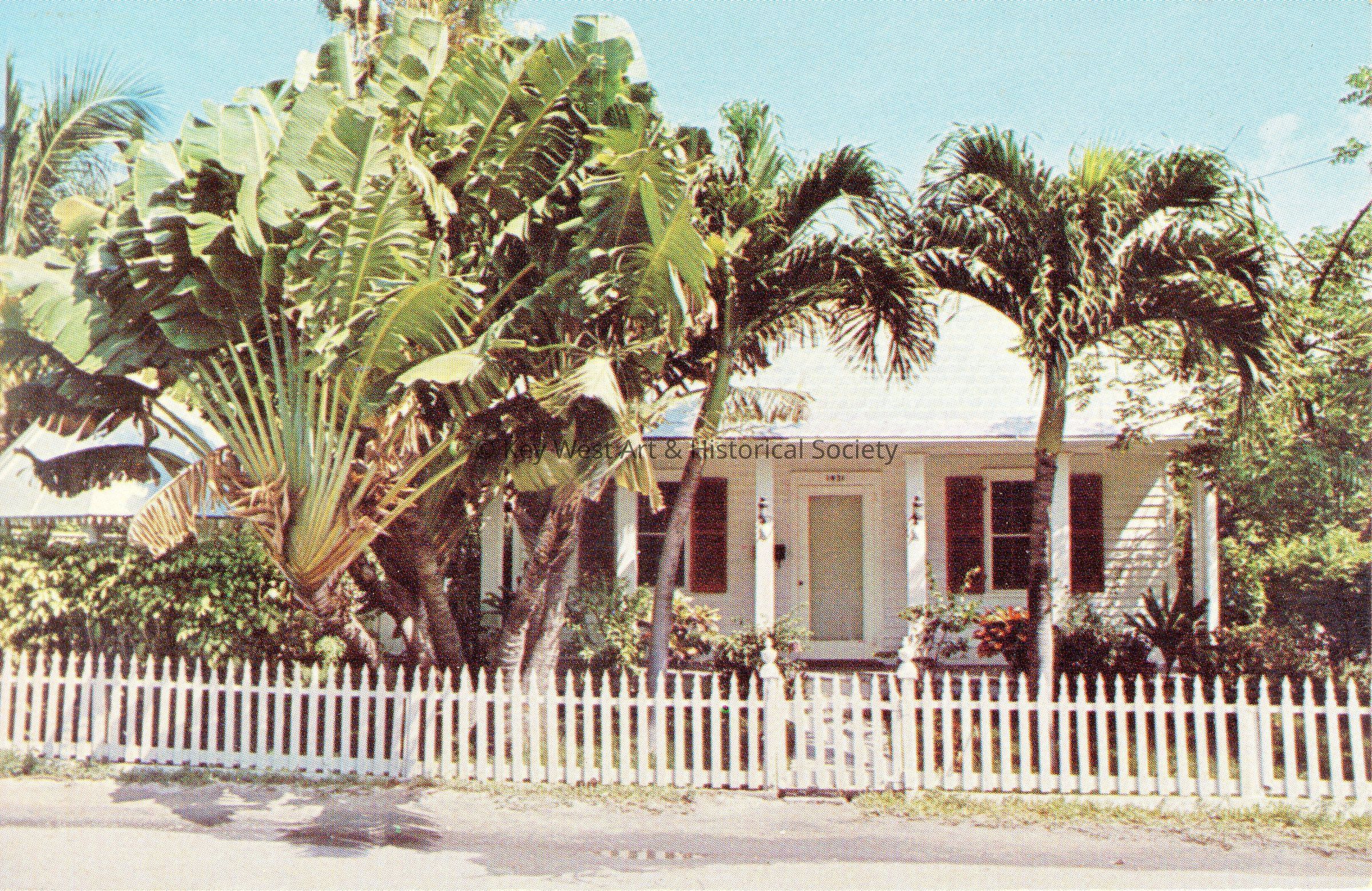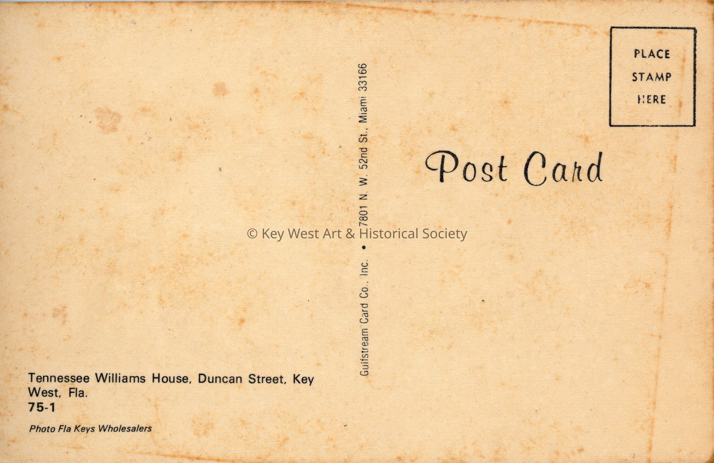 Postcard depicting a house with palm trees and a white picket fence. The description on the verso reads, 'Tennessee Williams House, Duncan Street, Key West, Fla.'Subject Place