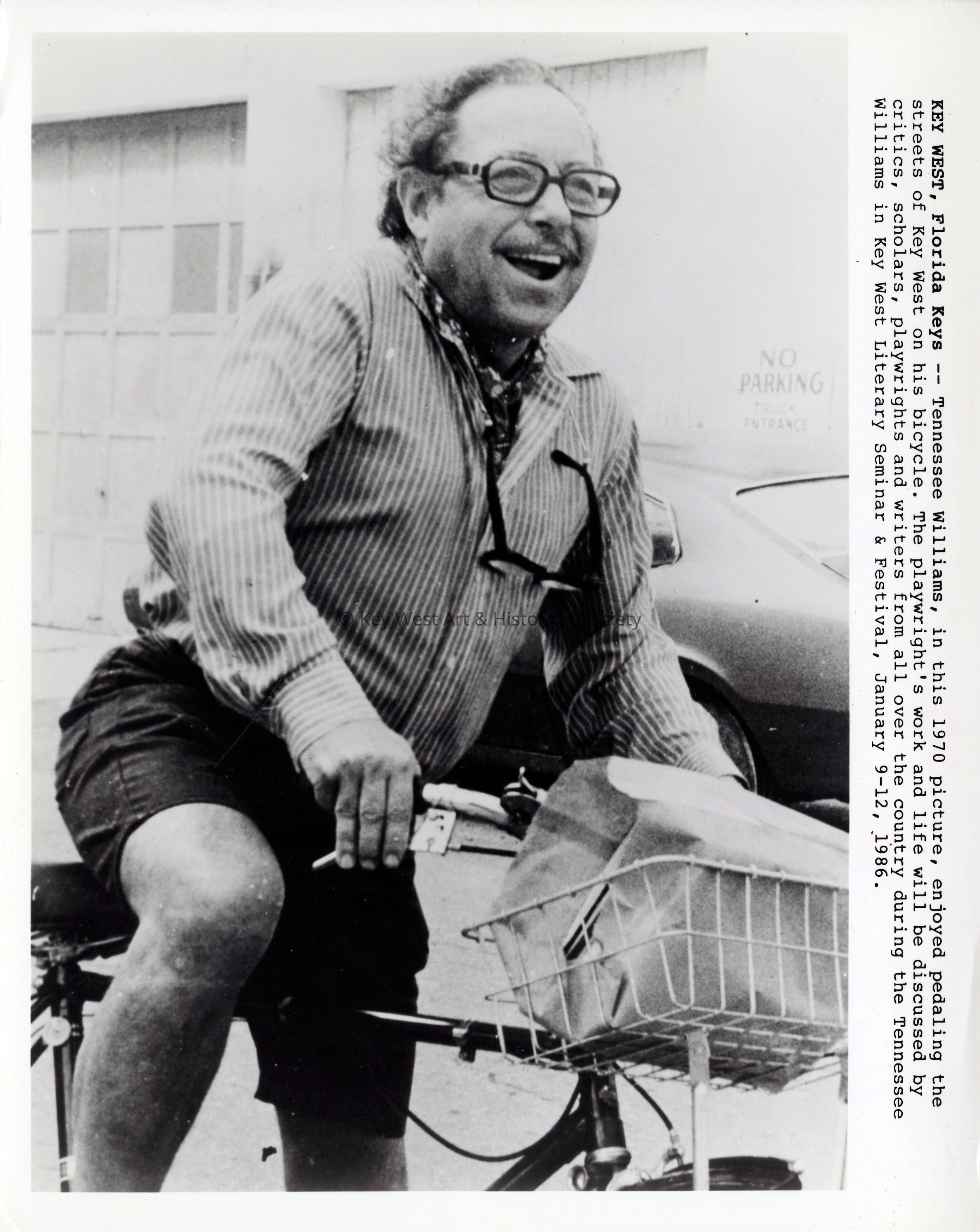 Black and white press photograph depicting Tennessee Williams riding his bicycle down a Key West street. Caption on right edge reads, 'Key West, Florida Keys -- Tennessee Williams, in this 1970 picture, enjoyed pedaling the streets of Key West on his bicycle. The playwright's work and life will be discussed by critics, scholars, playwrights and writers from all over the country during the Tennessee Williams in Key West Literary Seminar & Festival, January 9-12, 1986.'Photograph Details