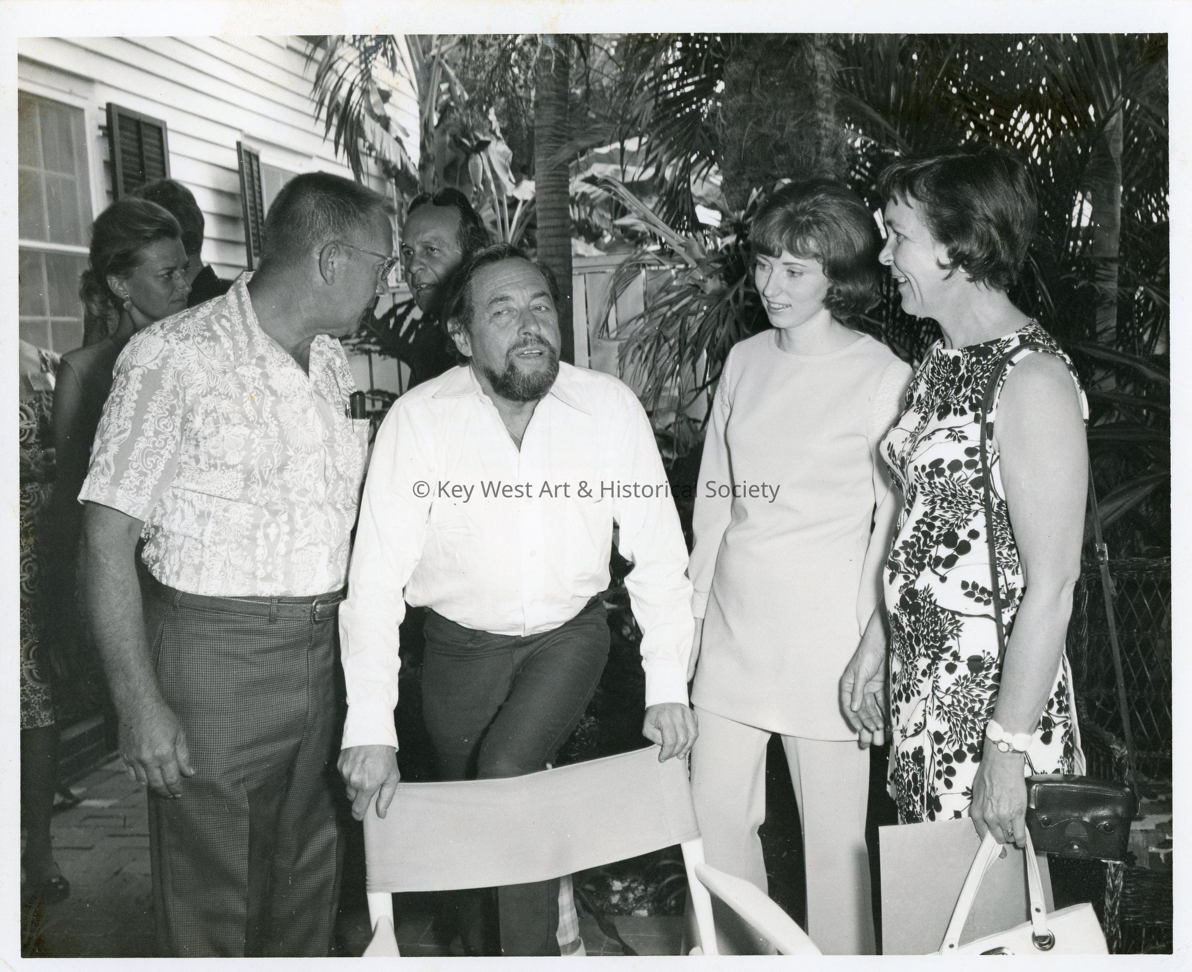 Black and white photograph of Tennessee Williams and friends at a garden party at his home at 1431 Duncan Street. David Wolkowsky is visible directly behind Williams.