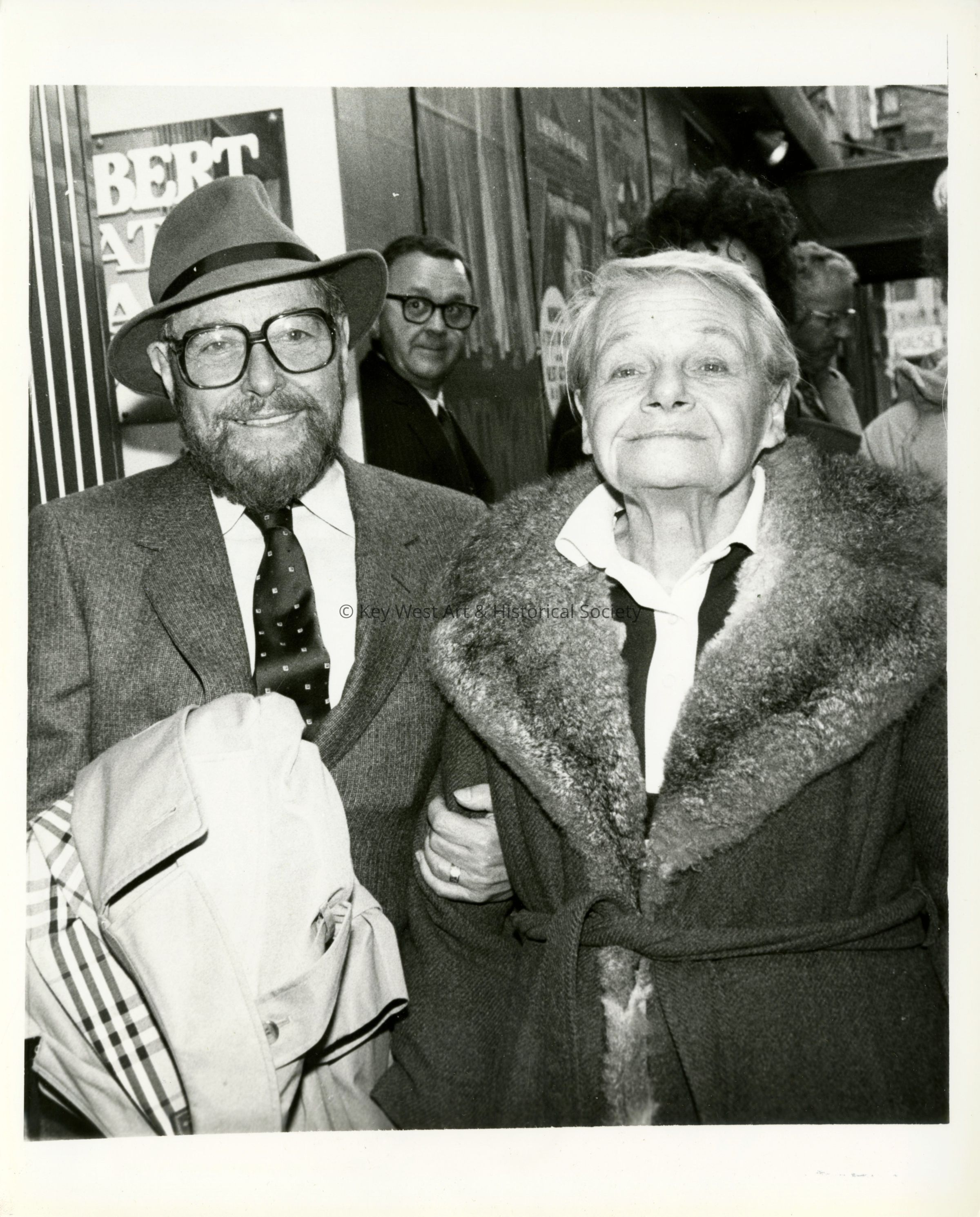 Black and white press photograph of Tennessee Williams holding the arm of his sister Rose Williams in New York City. Press caption on verso, 'NEW YORK: Playwright Tennessee Williams, 70, walks along with his 'beloved' sister, Rose, near the Shubert Theater November 19th. She was present at the theater as he and fellow playwright Harold Pinter were given the third annual Common Wealth Awards for their contributions to the dramatic arts. Williams said the ceremony coincided with Rose's birthday and said, 'I would like to dedicate the award to Rose Williams.''Photograph Details