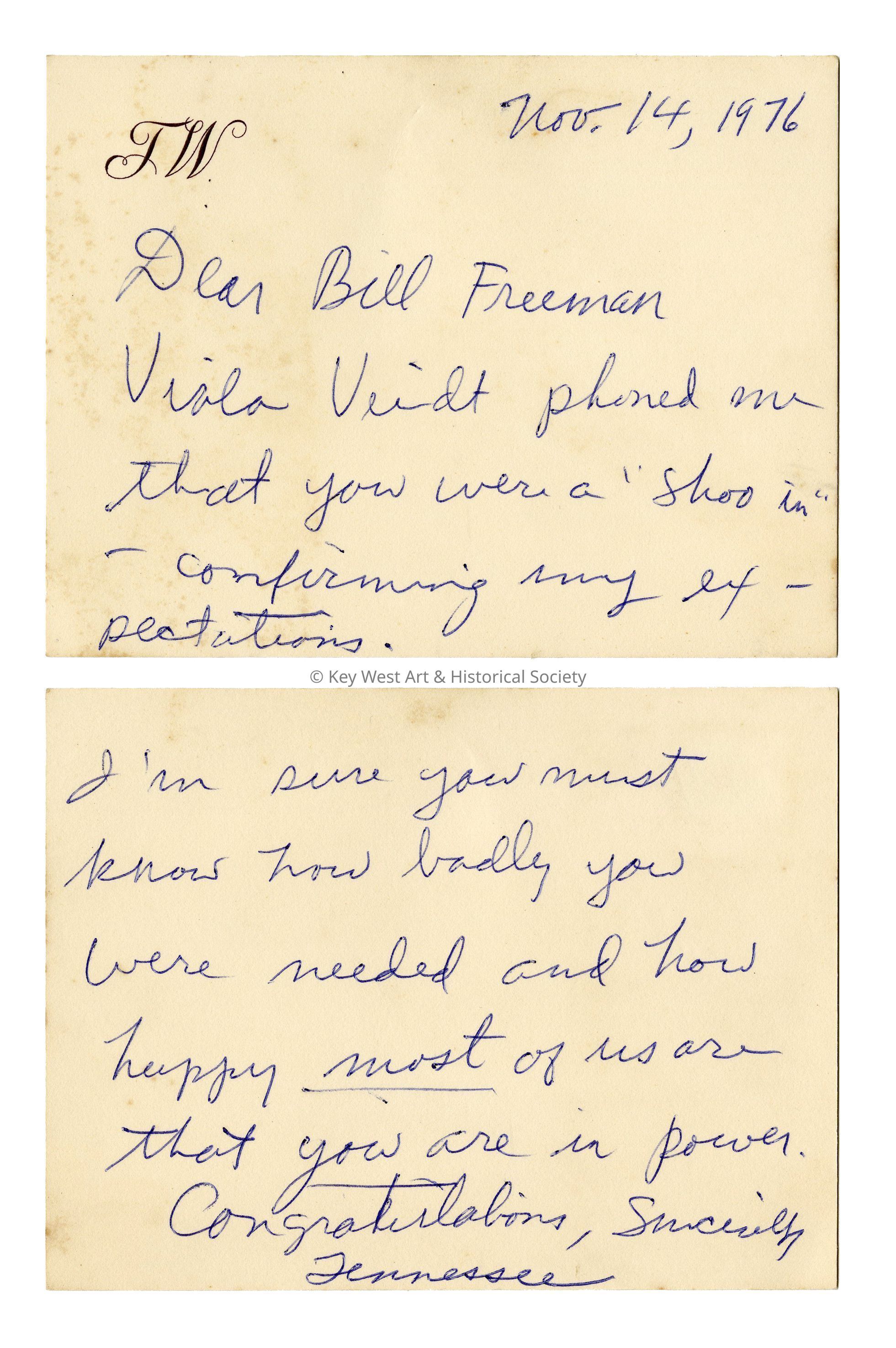 Handwritten thank you letter from Tennessee Williams to Sheriff William Freeman. Written on initialed notecard paper. Letter reads, 'Dear Bill Freeman, Viola Veidt phone me that you were a "shoo in" - confirming my expectations. I'm sure you must know how badly you were needed and how happy most of us are that you are in power. Congratulations. Sincerely, Tennessee'Collection