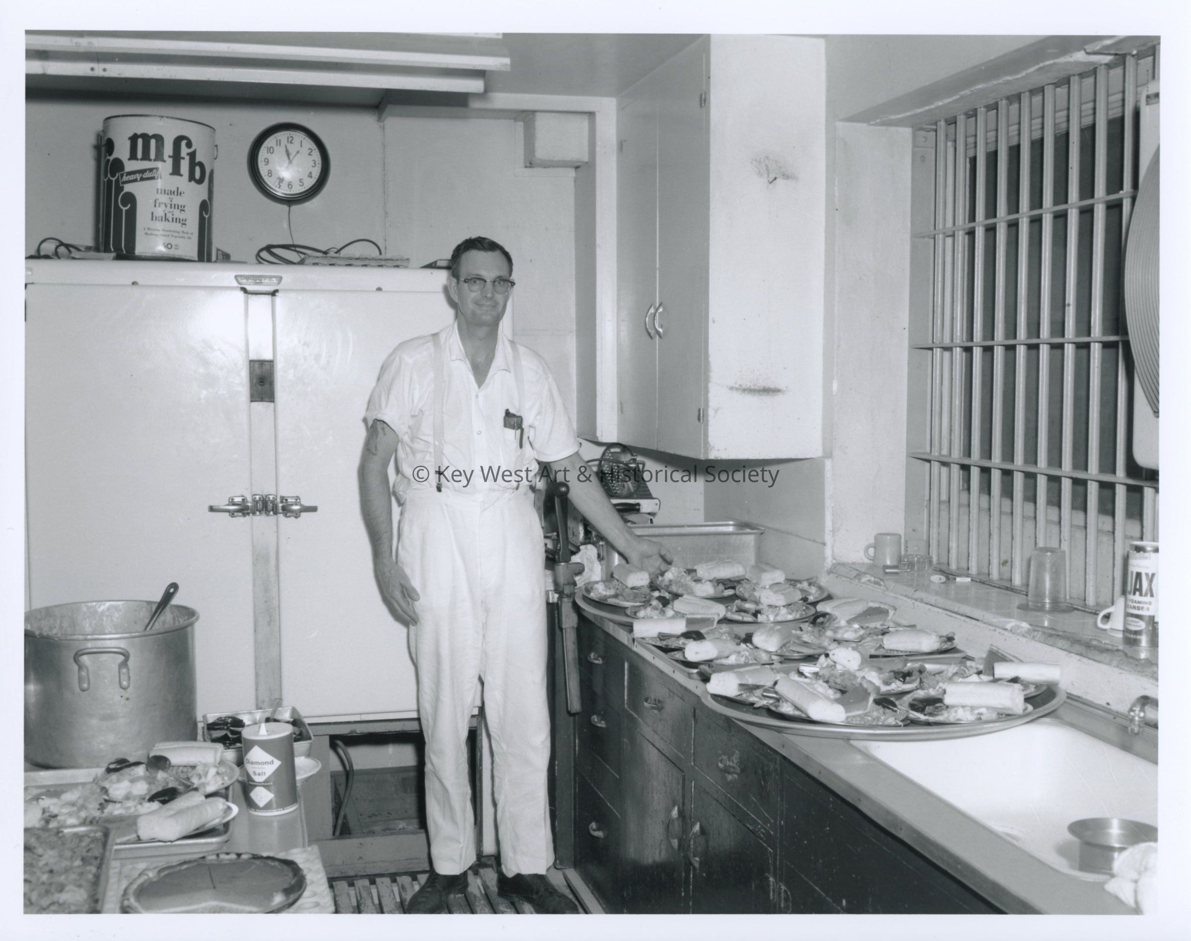 Black and white photograph of a mess specialist preparing what looks to be Thanksgiving dinner in the mid 20th century.