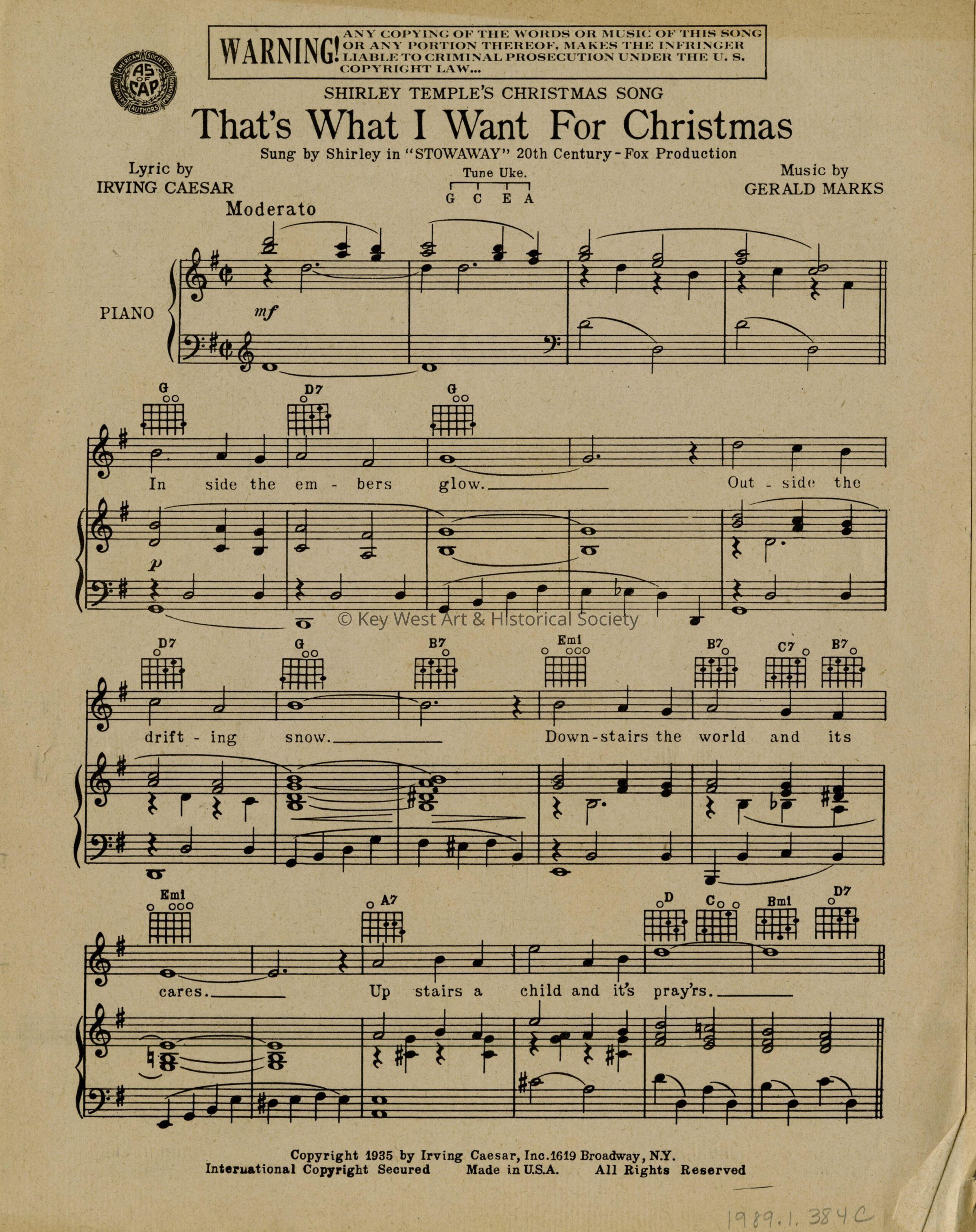 Sheet music for a song entitled 'That's What I Want For Christmas' the Shirley Temple Christmas song with lyrics by Irving Caesar and music by Gerald Marks.
