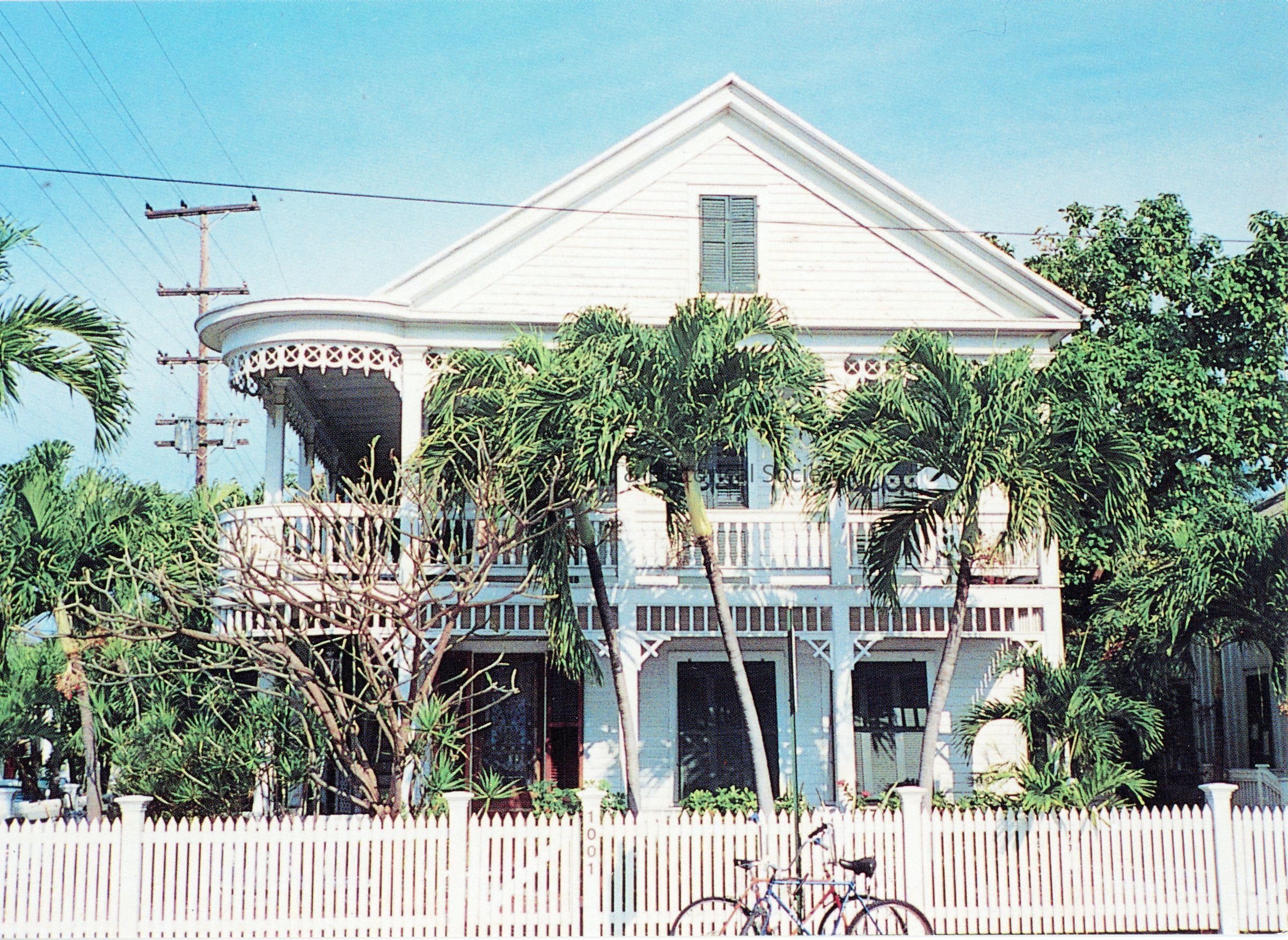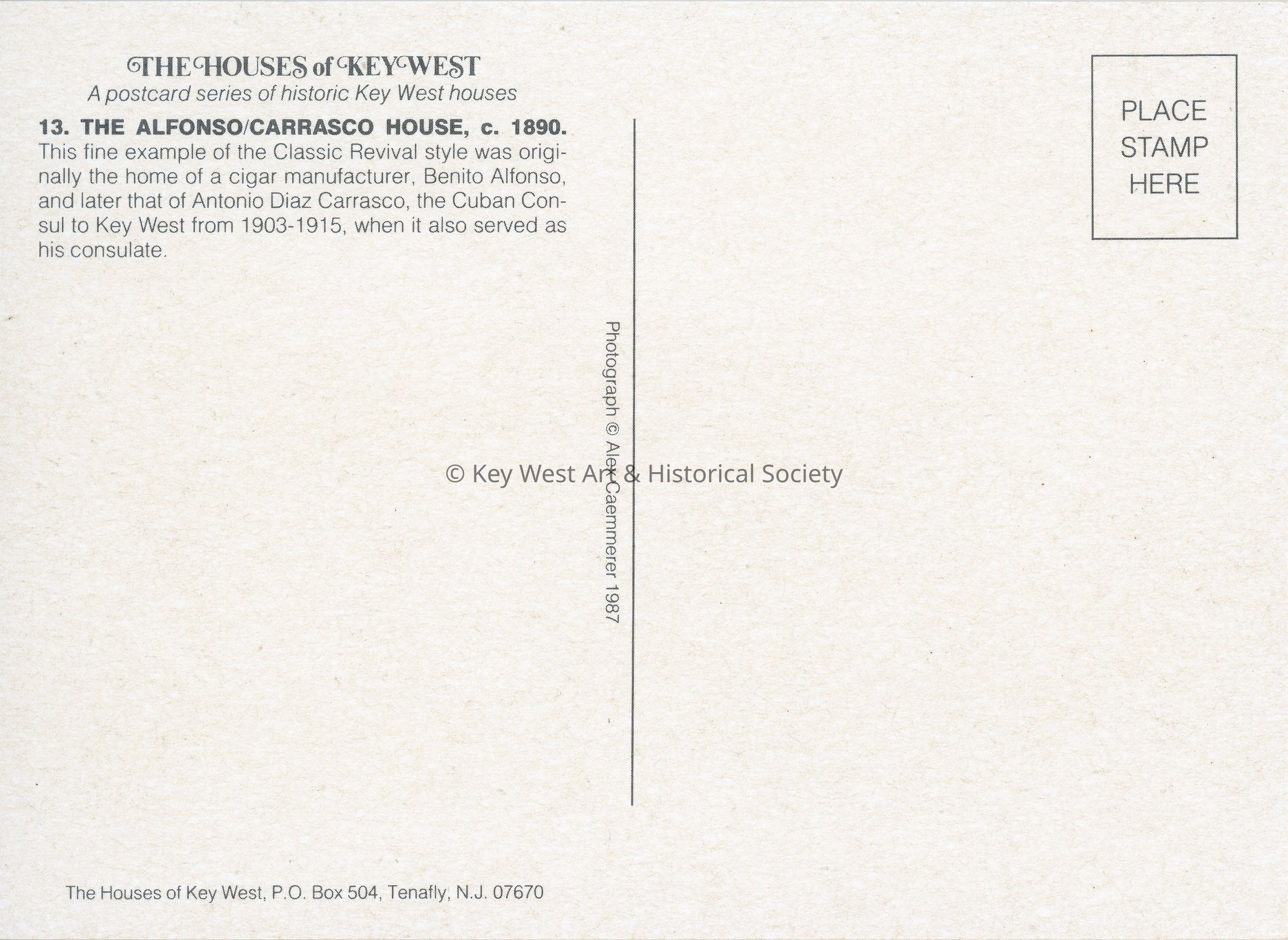 Postcard belonging to 'The Houses of Key West' series depicting the Alfonso/Carrasco House, located at 1001 Eaton Street. Notation on verso reads '13. THE ALFONSO/CARRASCO HOUSE c. 1890. This fine example of the Classic Revival style was originally the home of a cigar manufacturer, Benito Alfonso, and later that of Antonio Diaz Carrasco, the Cuban Consul to Key West from 1903-1915, when it also served as his consulate.'Subject Place
