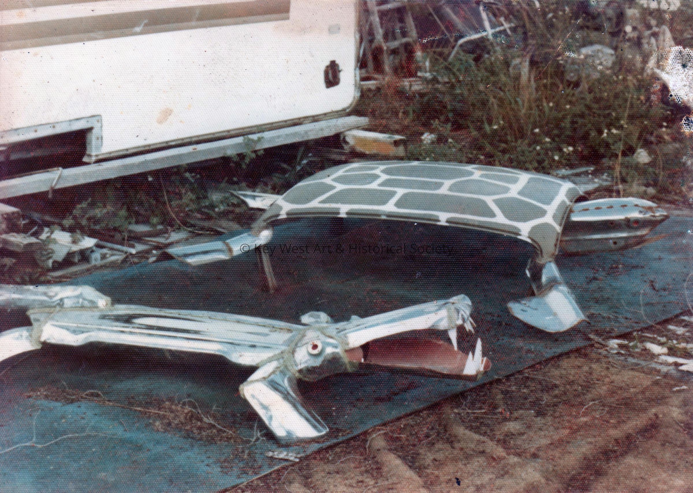 Color photograph of two Stanley Papio metal sculptures - the small alligator and the turtle.Photograph Details