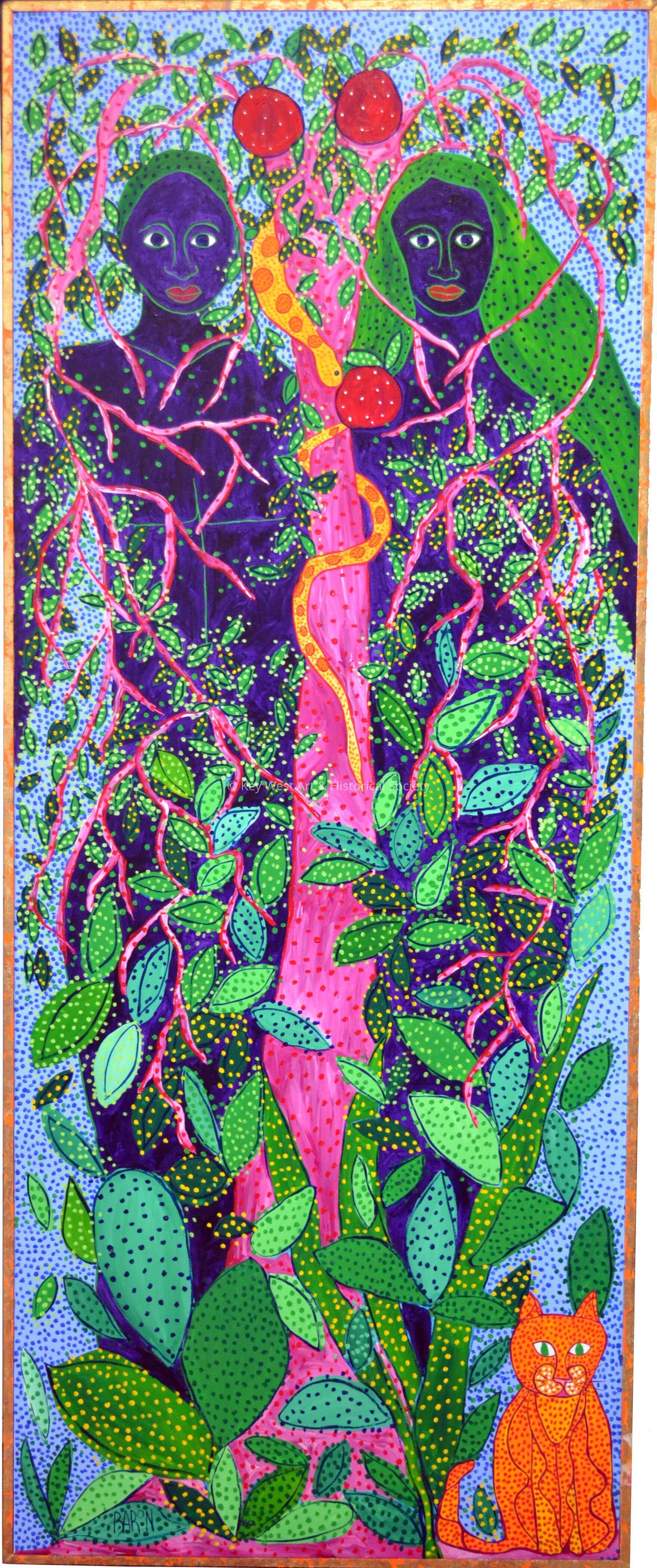Painting by Jack Baron depicting Adam and Eve standing in a garden with an apple tree between them. A snake is wrapped around the tree.Type of Painting