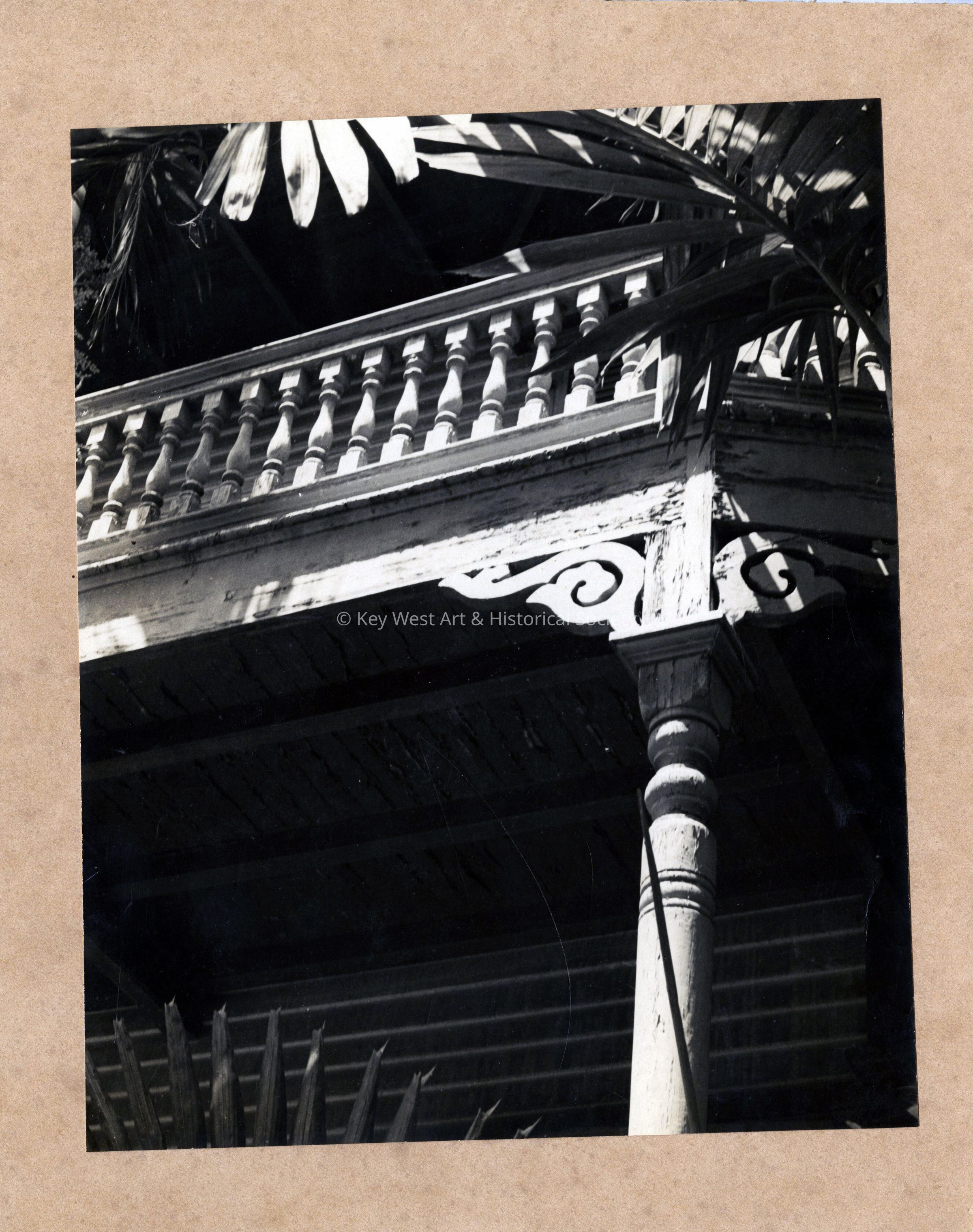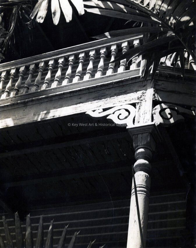 A black and white photograph of the gingerbread belonging to the Artist House, also known as the Otto House, located at 534 Eaton Street, taken by Sheila Shaw.Photograph Details