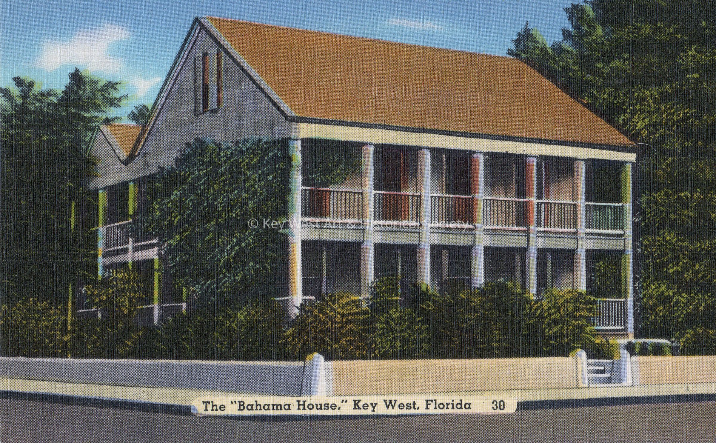 Postcard depicting the “Bahama House” in Key West, Florida. The description on the verso reads, ‘The Bahama House built in the Bahamas many years ago, it has long been a landmark in Key West. The fact that its morticed and pinioned timbers were taken apart in the place of its origin, transported in Schooners and erected here, has given rise to the weird legend that it was floated here a la Noah’s Ark.’Collection