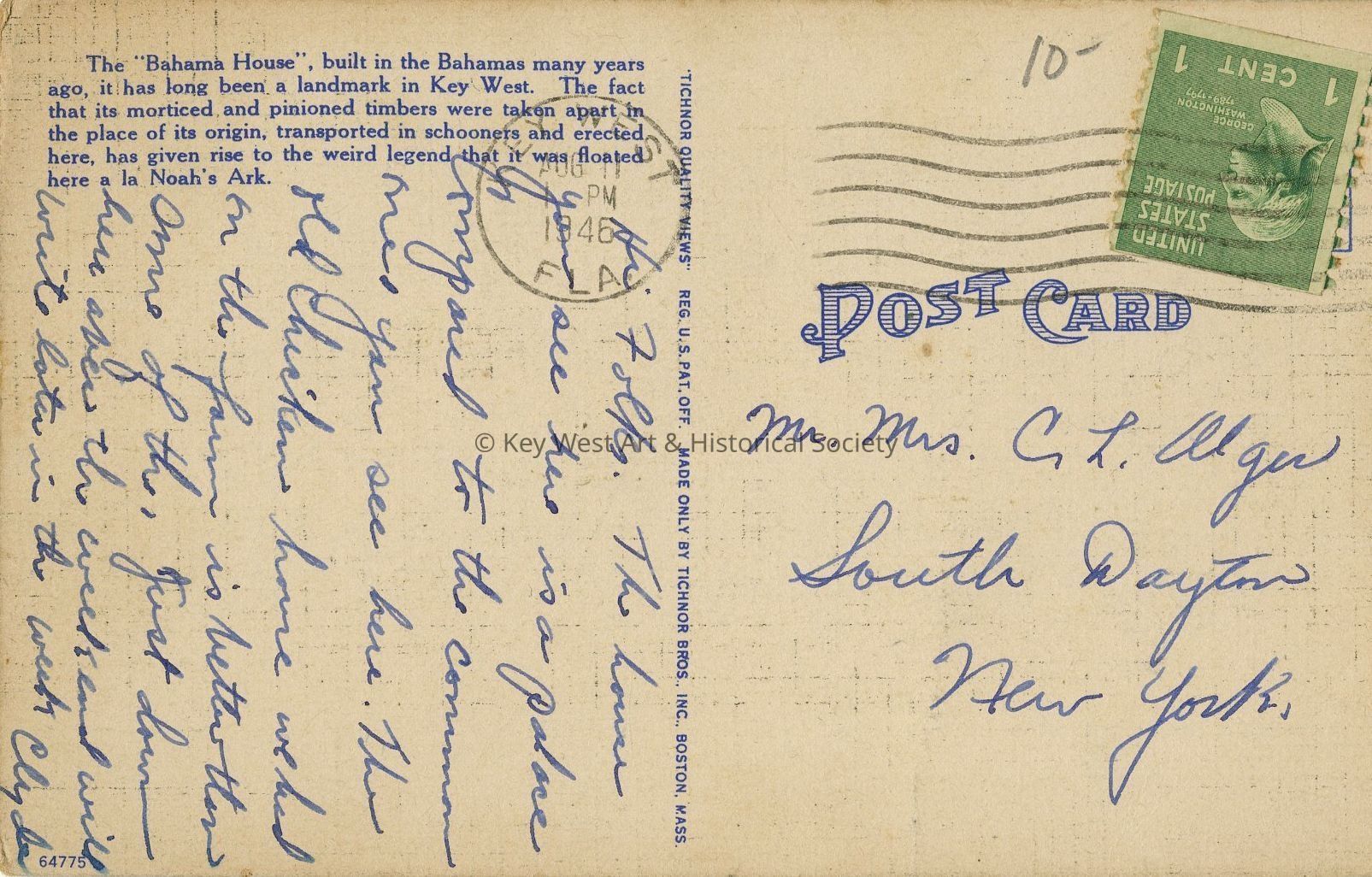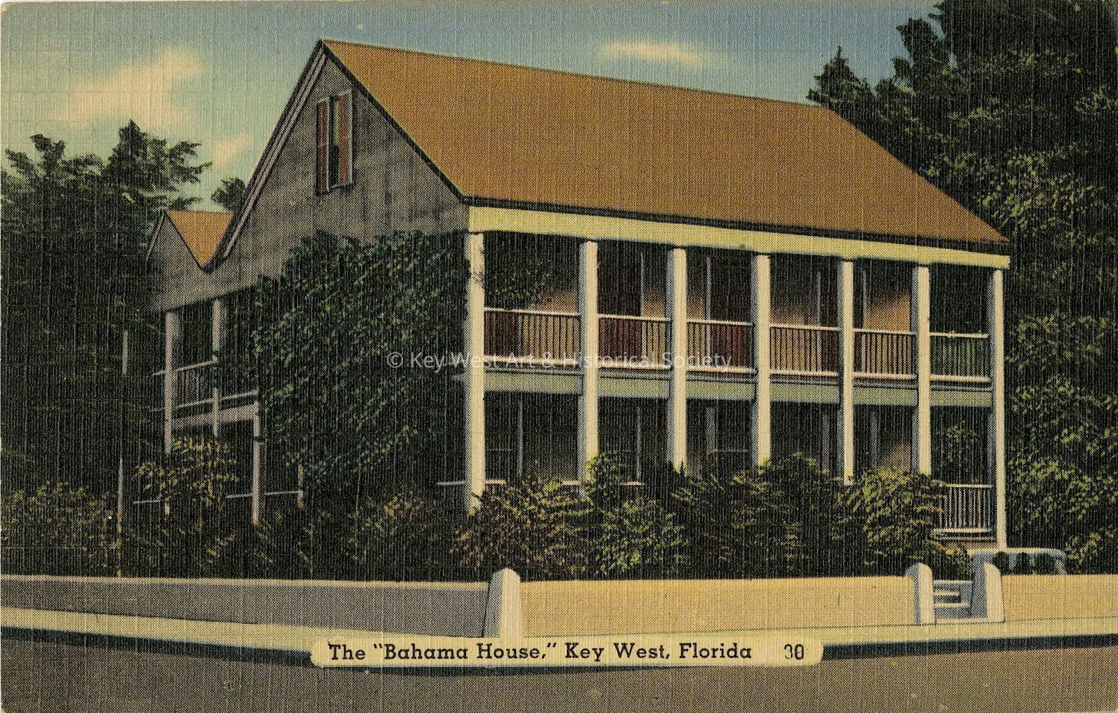 Postcard depicting the "Bahama House," in Key West, Florida. Notation on verso, 'The Bahama House, built in the Bahamas many years ago, it has long been a landmark in Key West. The fact that its morticed and pinioned timbers were taken apart in the place of its origin, transported in schooners and erected here, has given rise to the weird legend that it was floated here a la Noah's Ark.'Collection