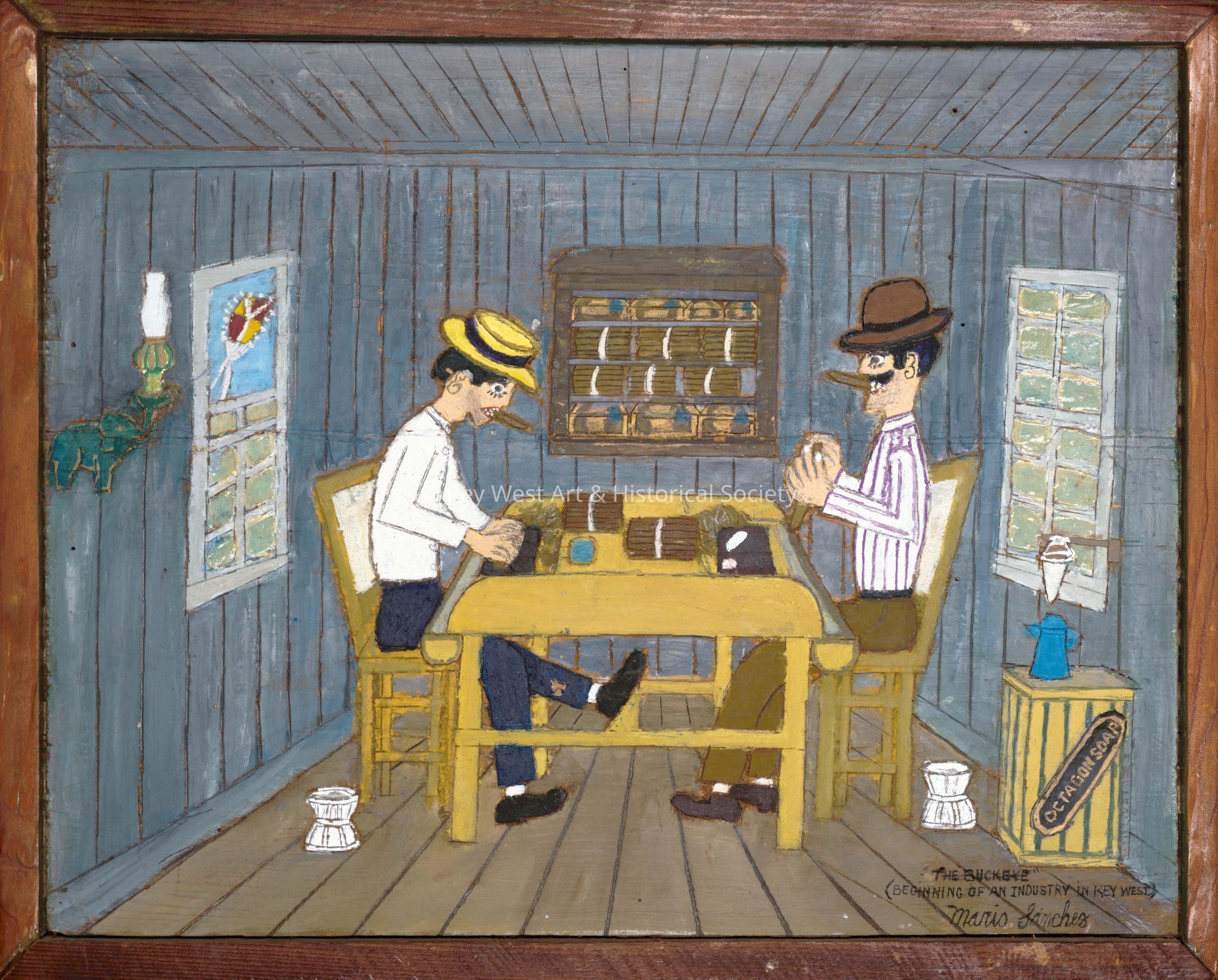 Caption in file reads, 'Besides the large manufacturers of cigars in Key West, there were also buckeye cigar makers. They were small units, often 2 or 3 workers, operating in a private home. Like the large companies, buckeyes had permits fro the Internal Revenue Service. Most of them were successful in their ventures and moved to larger buildings, employing hundreds of cigar makers'.Type of Sculpture