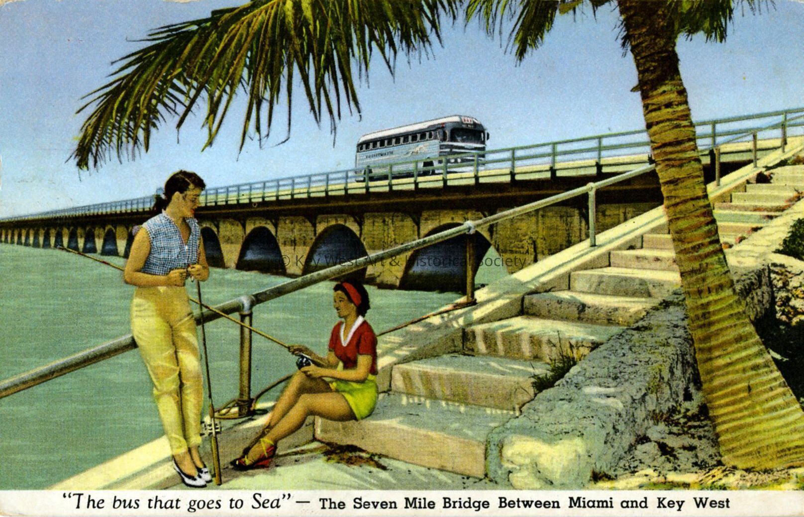 Postcard depicting a bus on a bridge near two women fishing. The caption reads, ‘“The bus that goes to sea". The Seven Mile Bridge Between Miami and Key West.' The description on the verso reads, 'One of Florida Greyhound's most popular Expense-Paid Tours follows the famous Overseas Highway from Miami to Key West - southernmost city in the United States - along 116 scenic miles of bridges and tropic islands.'Subject Place