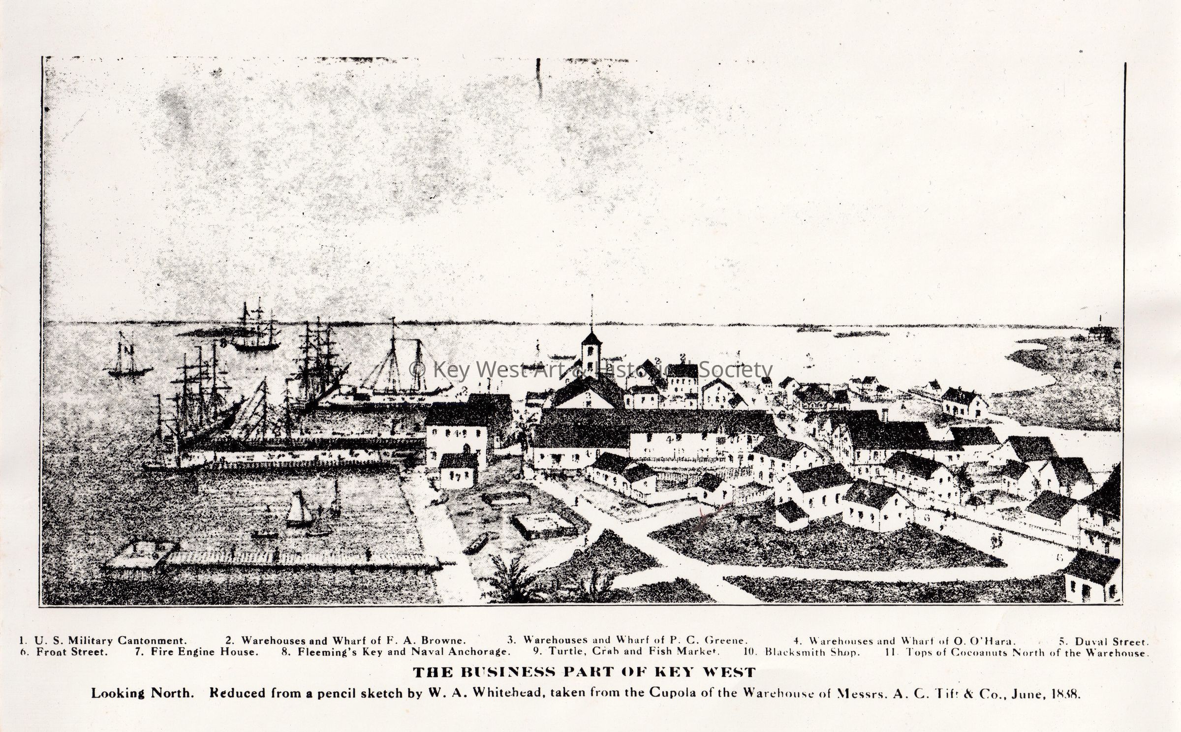 Black and white photograph of a sketch created by William Whitehead of the waterfront area of Key West Bight. Sketch was completed from that top of Asa Tift Tower. (including US Military Cantonment; Browne/Greene/O'Hara Warehouses and Wharves; Duval/Front Streets; Turtle Crab and Fish Market).Photograph Details