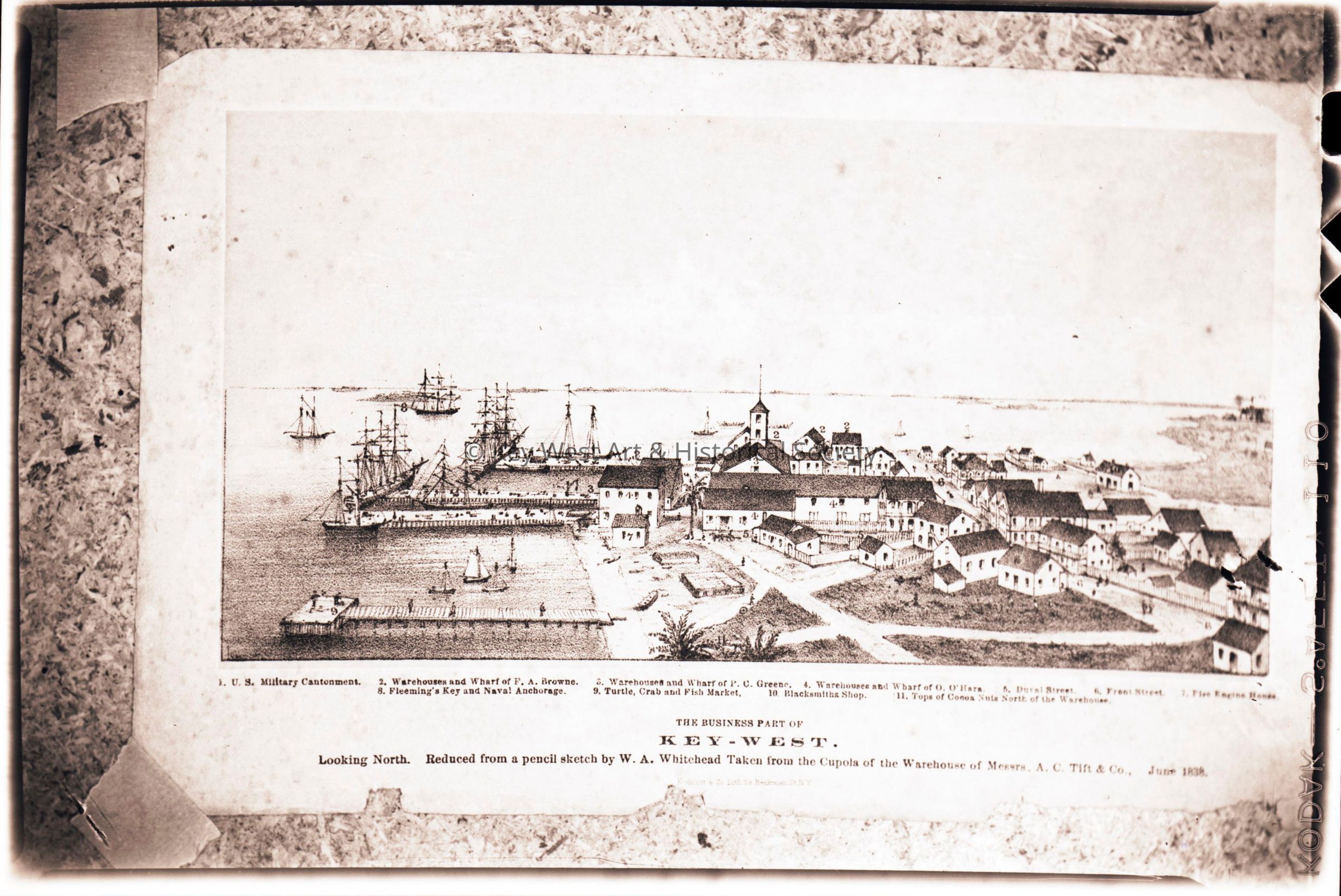 Black and white photographic negative depicting a sketch of Key West done by W. A. Whitehead.