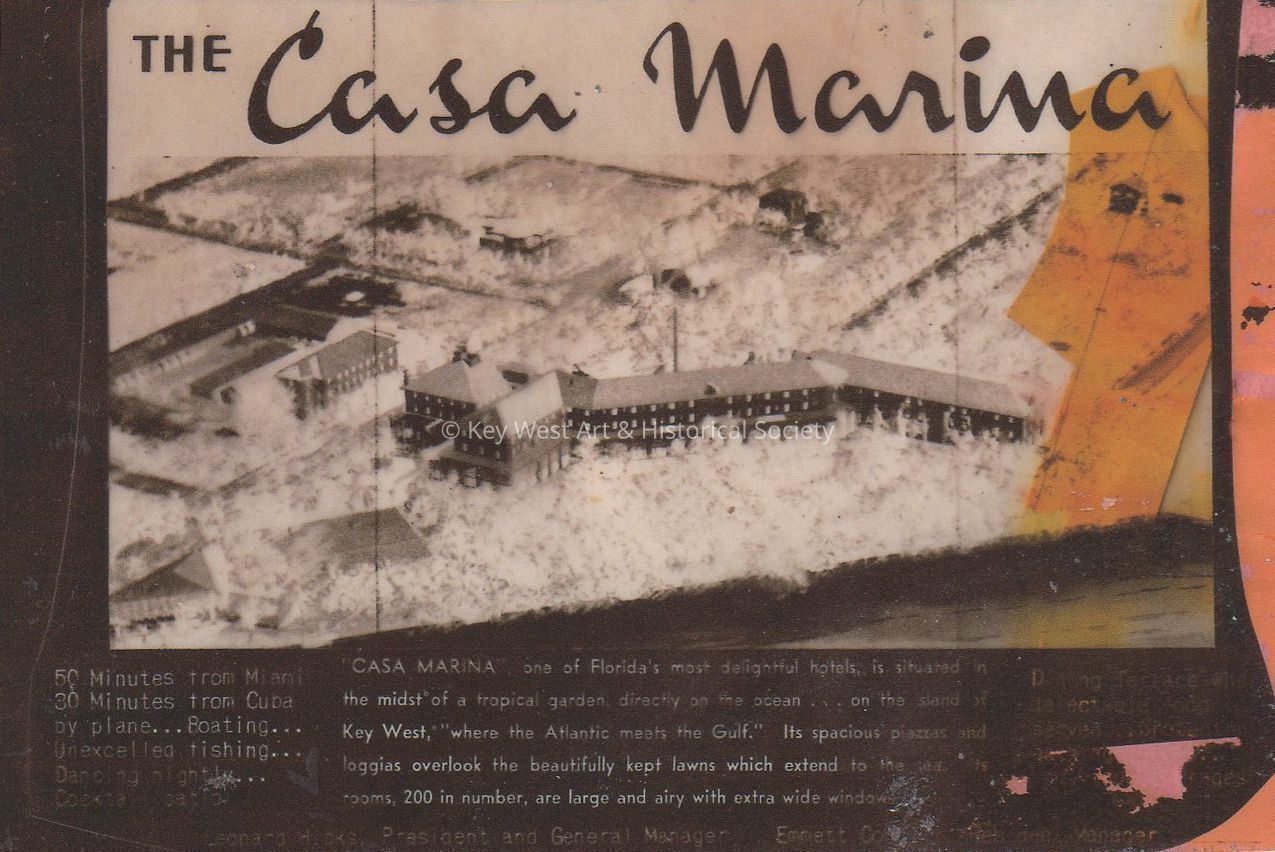 Black and white photograph of a brochure cover advertising the Casa Marina Hotel. Caption reads, 'Casa Marina, one of Florida's most delightful hotels, is situated in the midst of a tropical garden, directly on the ocean...on the sand of Key West, "where the Atlantic meets the Gulf." Its spacious piazzas and loggias overlook the beautifully kept lawns which extens to the sea. Its rooms, 200 in number, are large and airy with extra wide windows.'Photograph Details