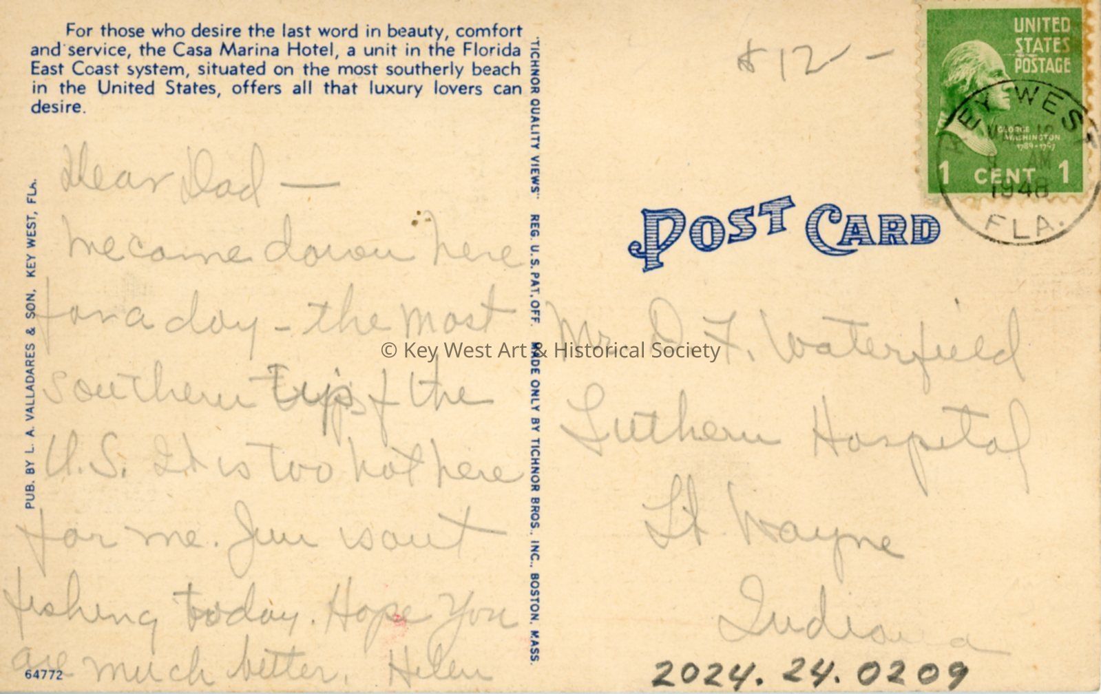 Postcard depicting the Casa Marina Hotel, Key West, Florida. "For those who desire the last word in beauty, comfort and service, the Casa Marina Hotel, a unit in the Florida East Coast System, situated on the most southerly beach in the United States, offers all that luxury lovers can desire."Collection