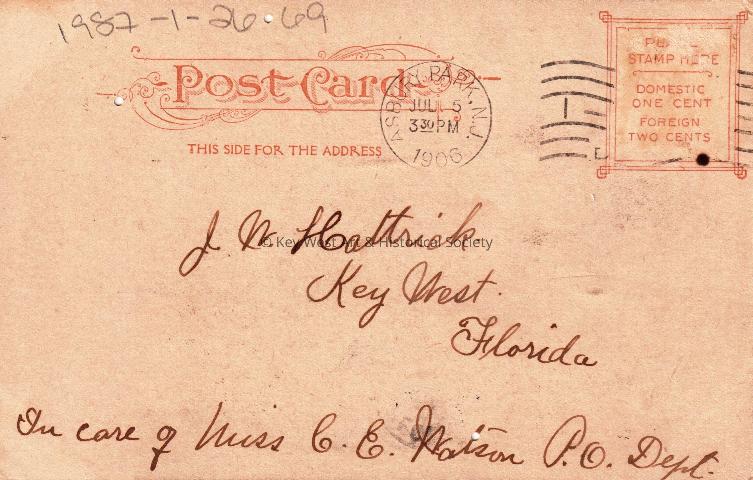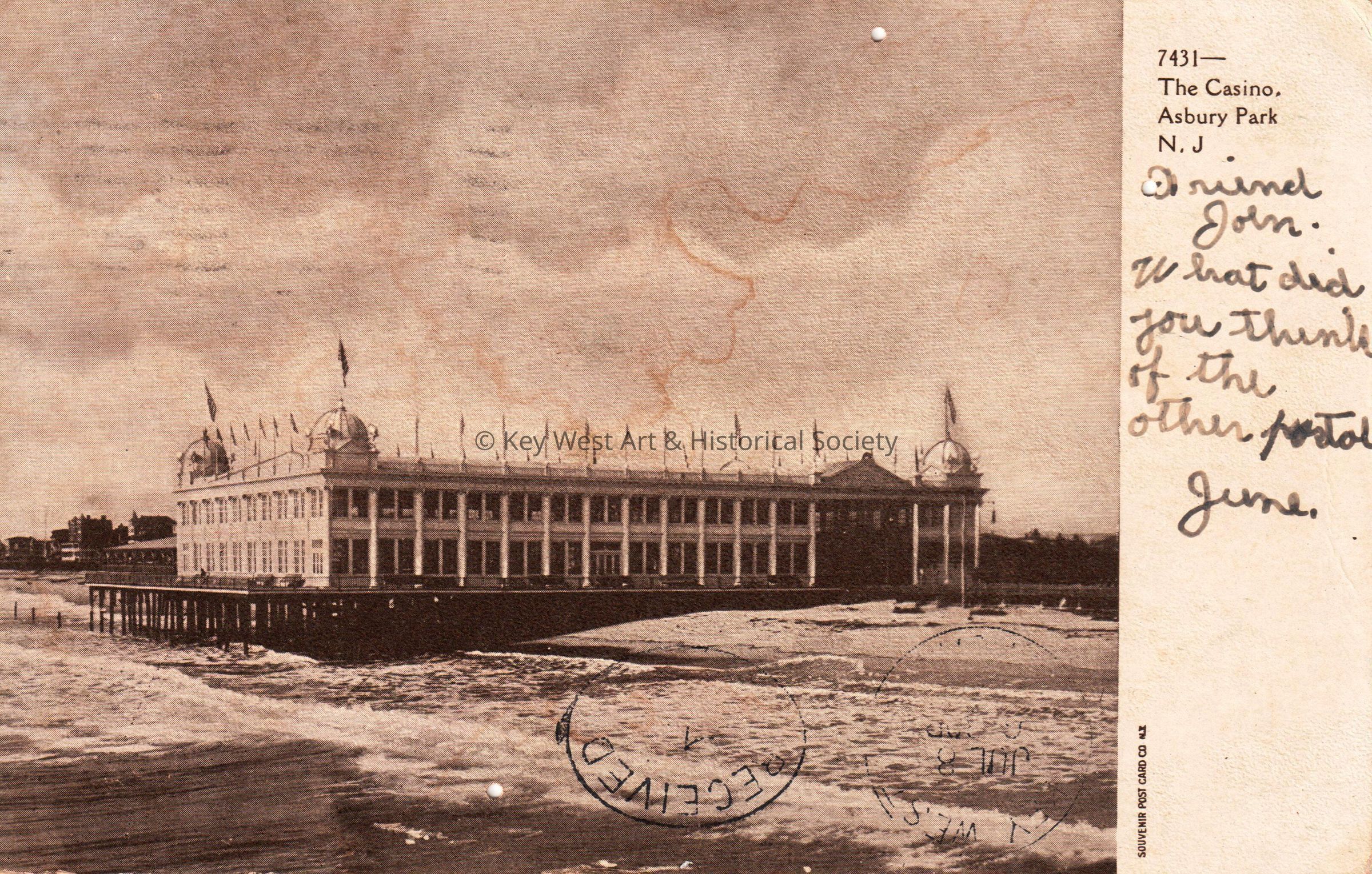 Postcard depicting a large building on the beach. The caption reads, ‘The Casino, Asbury Park, New Jersey’. The message on the front reads, ‘Friend John, what did you think of the other postal? June’. The card is addressed to J. W. Hattrick, Key West, Florida, in care of Miss C. E. Watson post office department, and is postmarked Asbury Park, New Jersey, July 5, 1906.Subject Place