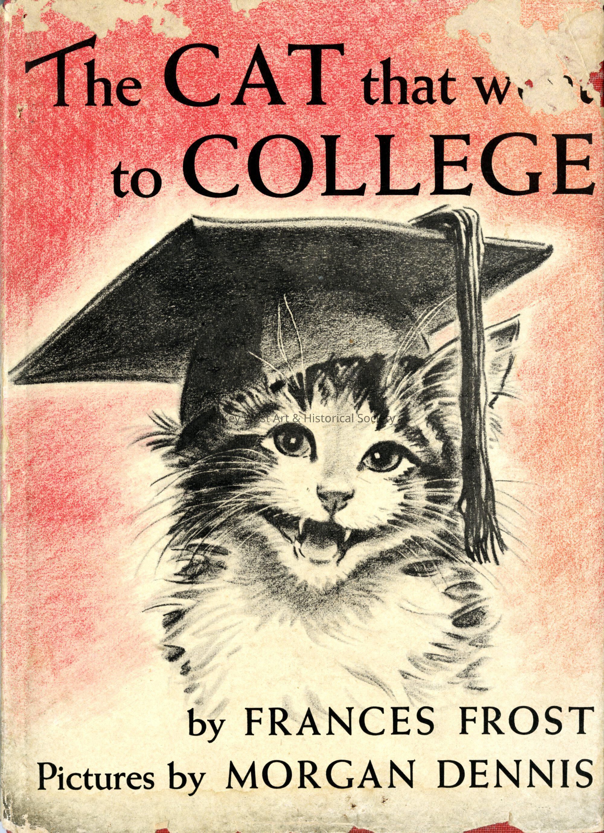 Hardcover book entitled 'The Cat That Went to College' by Frances Frost with black and white illustrations by Morgan Dennis. Signed to Louise White by Dennis.Collection
