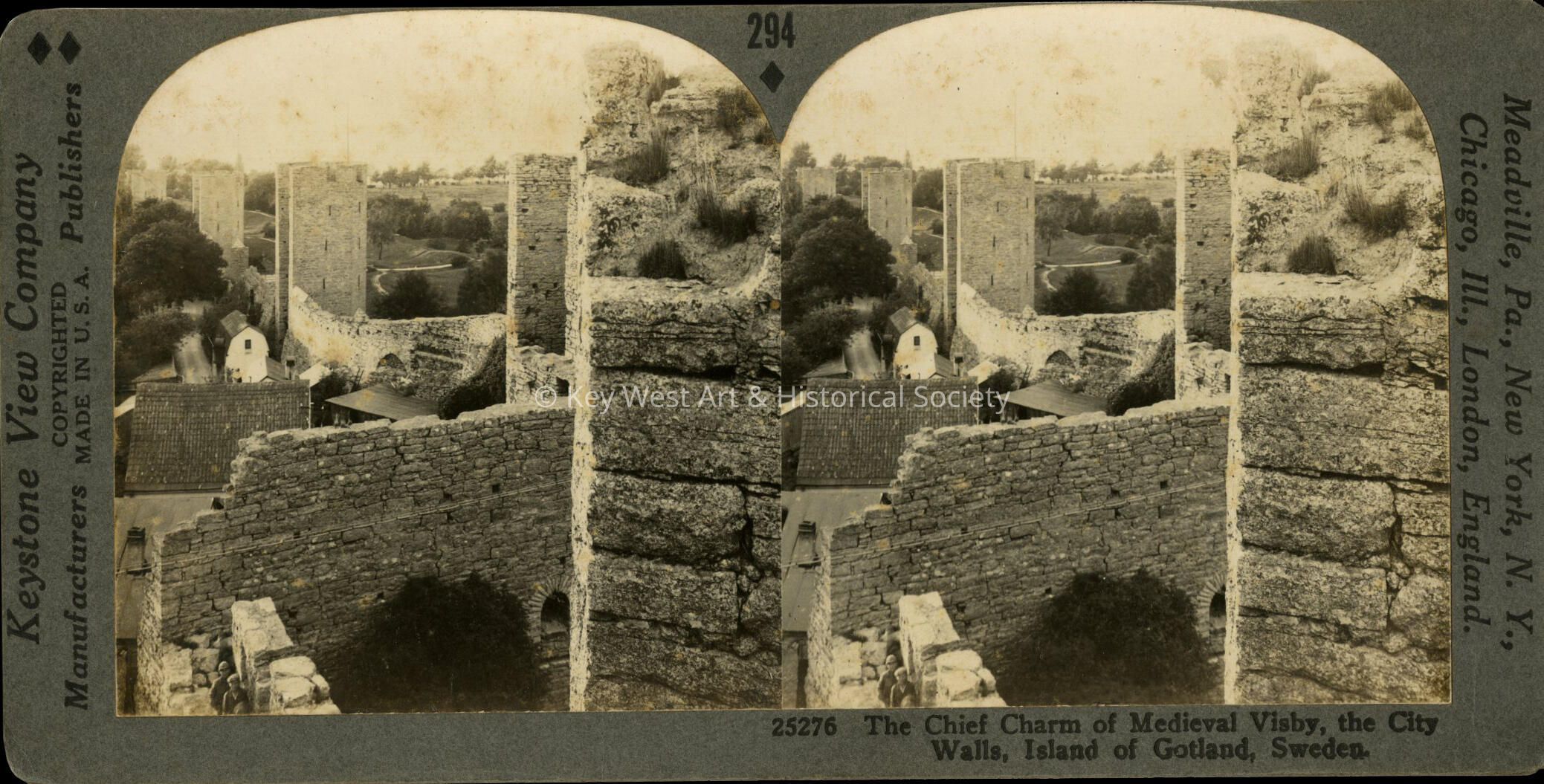 Black and white stereoview of the Chief Charm of Medieval Visby, the City Walls, Island of Gotland, Sweden. Extensive description printed on verso.Collection