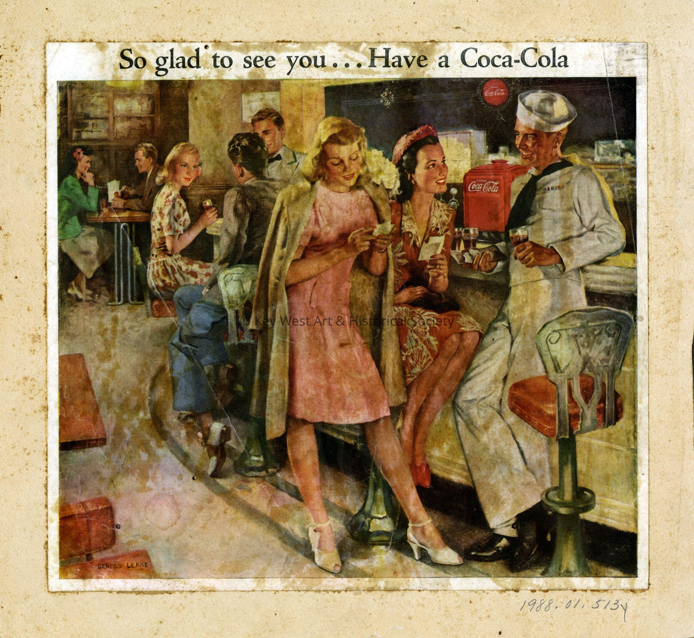 Illustration by Gerald Leake for a Coca-Cola Company advertisement. The illustration depicts two young ladies and a young Navy sailor at a soda bar.