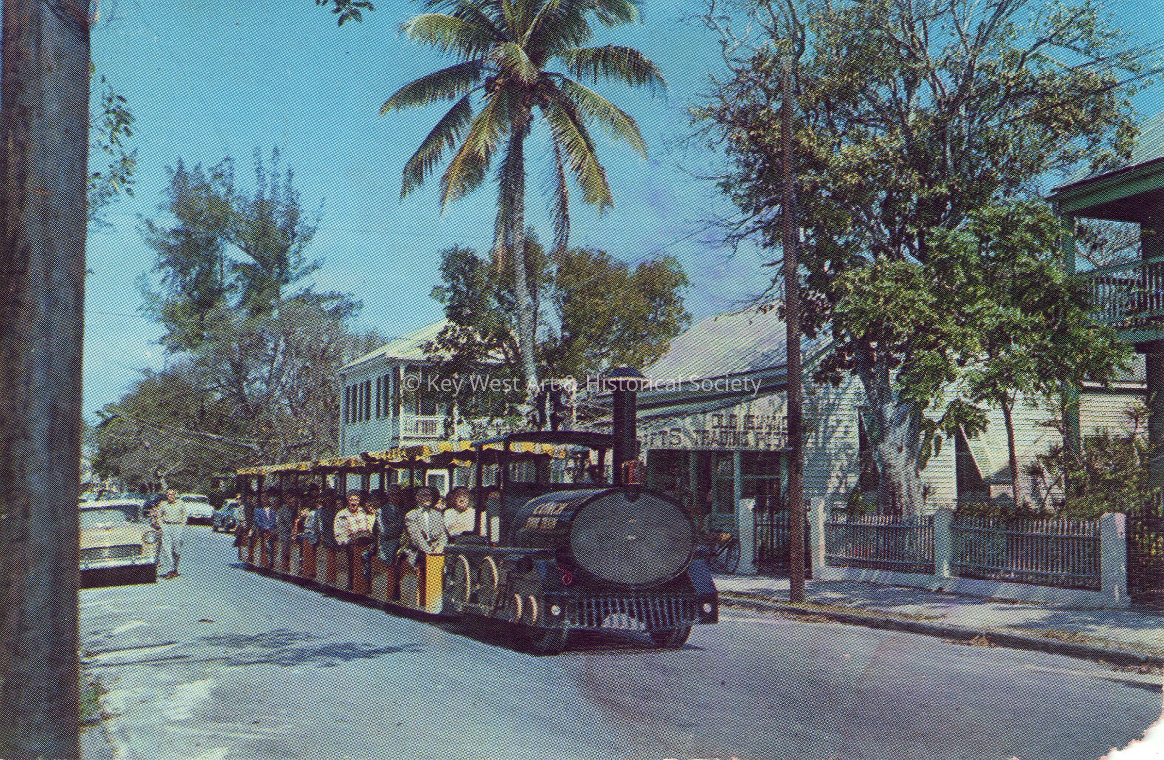 Postcard depicting passengers on the Conch Tour Train traveling on Whitehead Street. The description on the verso reads, ‘The Conch Tour Train, Key West, Florida. This unique sightseeing train operates on the historic island Of Key West, the Nation’s Southernmost City.’ The message on the verso reads, ‘August 19, Key West, This little train started operating last winter and has been a huge success – One of our aviator tenants called our attention to this new card and said “that's my car to the left and Henry Lee beside it”. The train stops for passengers at Trading Post. Henry is delighted with his little house. Has dinner every night at S&S with John Thompson (your old friend).’Subject Place
