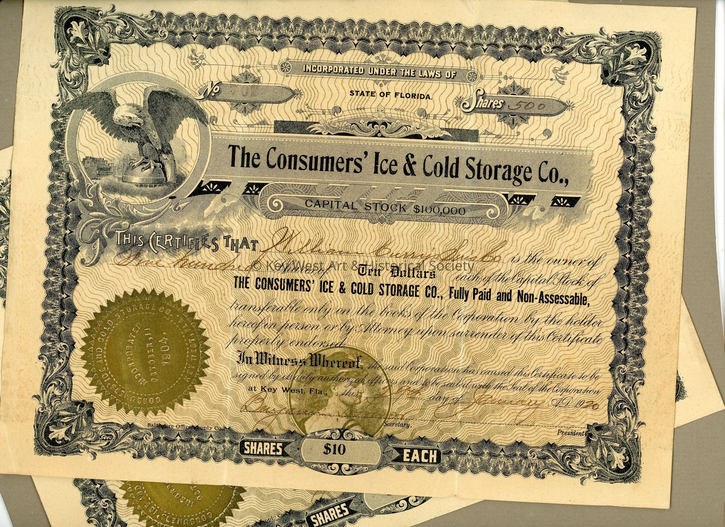 Two stock certificates for The Consumers' Ice & Cold Storage Co. for five hundred shares at $10 a share owned by William Curry Sons, Inc. The certificates were adhered to a board for display in Wachovia Bank when it was formerly located at 420 Front Street.Collection