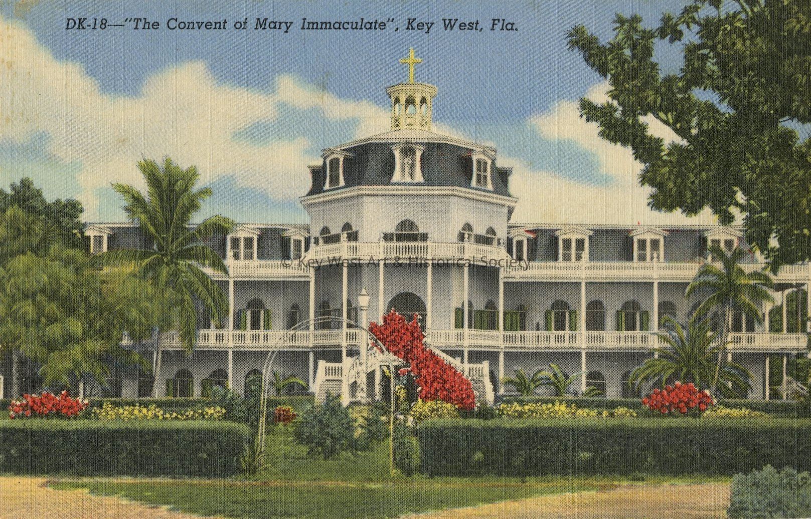 Postcard depicting "the Convent of Mary Immaculate" in Key West, Florida. Notation on verso, 'Convent of Mary Immaculate was built in 1868. This building was used as a hospital during the Spanish-American War and it houses an interesting exhibit of antiques in it's museum.'Collection