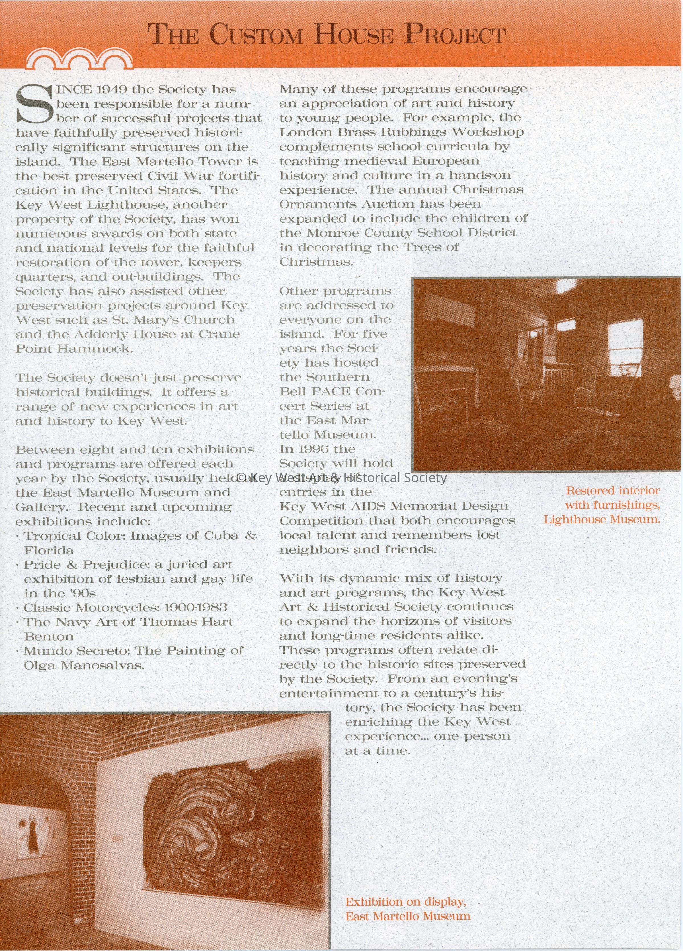 An informational pamphlet detailing the work Key West Art & Historical Society has done to preserve history and serve the community in Key West. It also includes the history of the Custom House and how the Society plans to utilize the property once it is opened. The pamphlet was made as part of a capital and endowment campaign for the restoration and preservation of the Custom House.Collection
