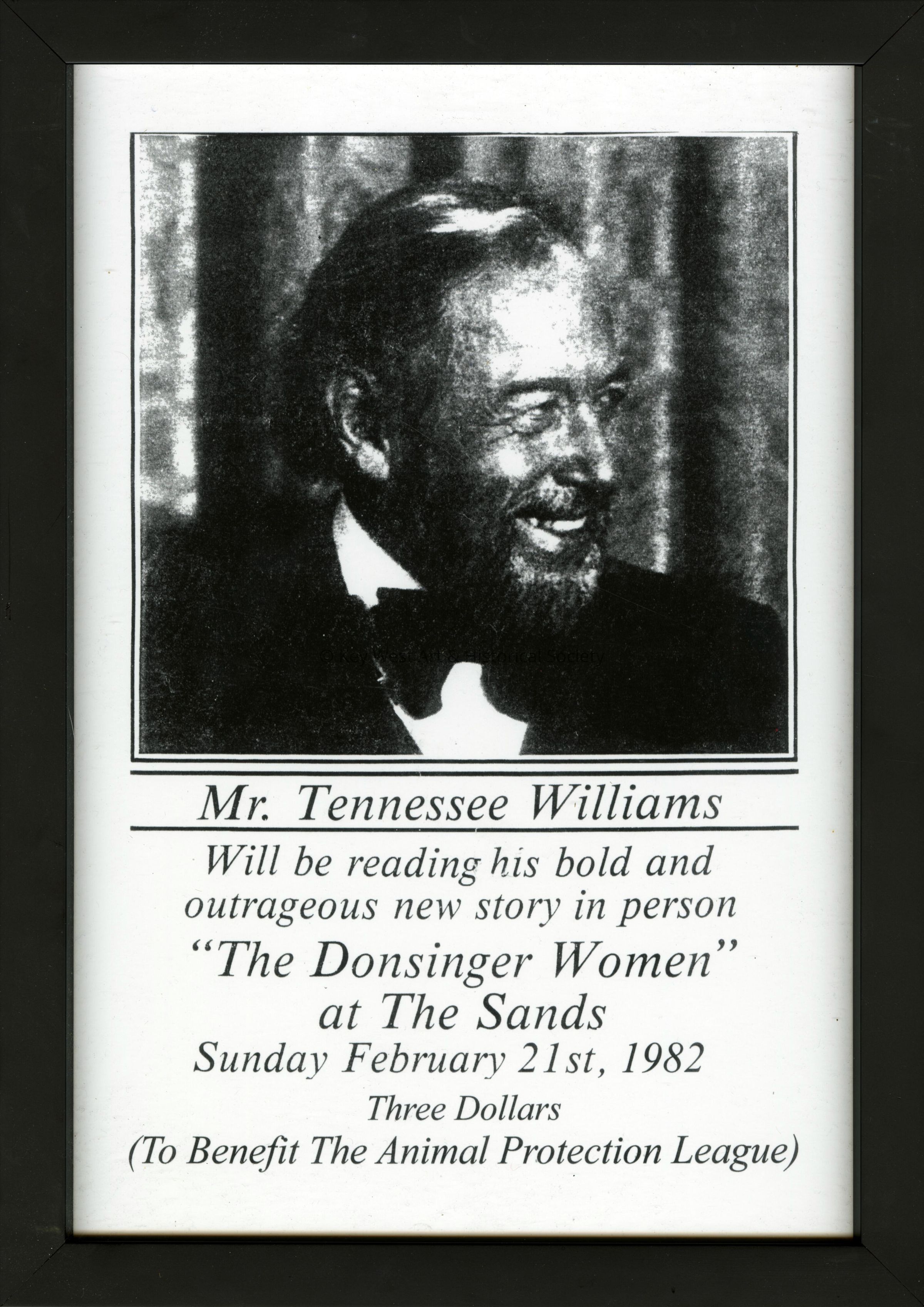 Framed poster advertising Tennessee Williams reading his short story 'The Donsinger Women and Their Handyman Jack' at the Sands Hotel. Admission was $3 and was a fundraiser for the Animal Protection League.Collection
