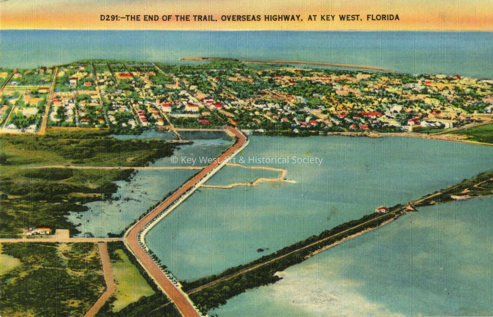 Linen postcard depicting the Overseas Highway at Key West. The caption reads ‘The End of the Trail, Overseas Highway, at Key West, Florida'.Subject Place