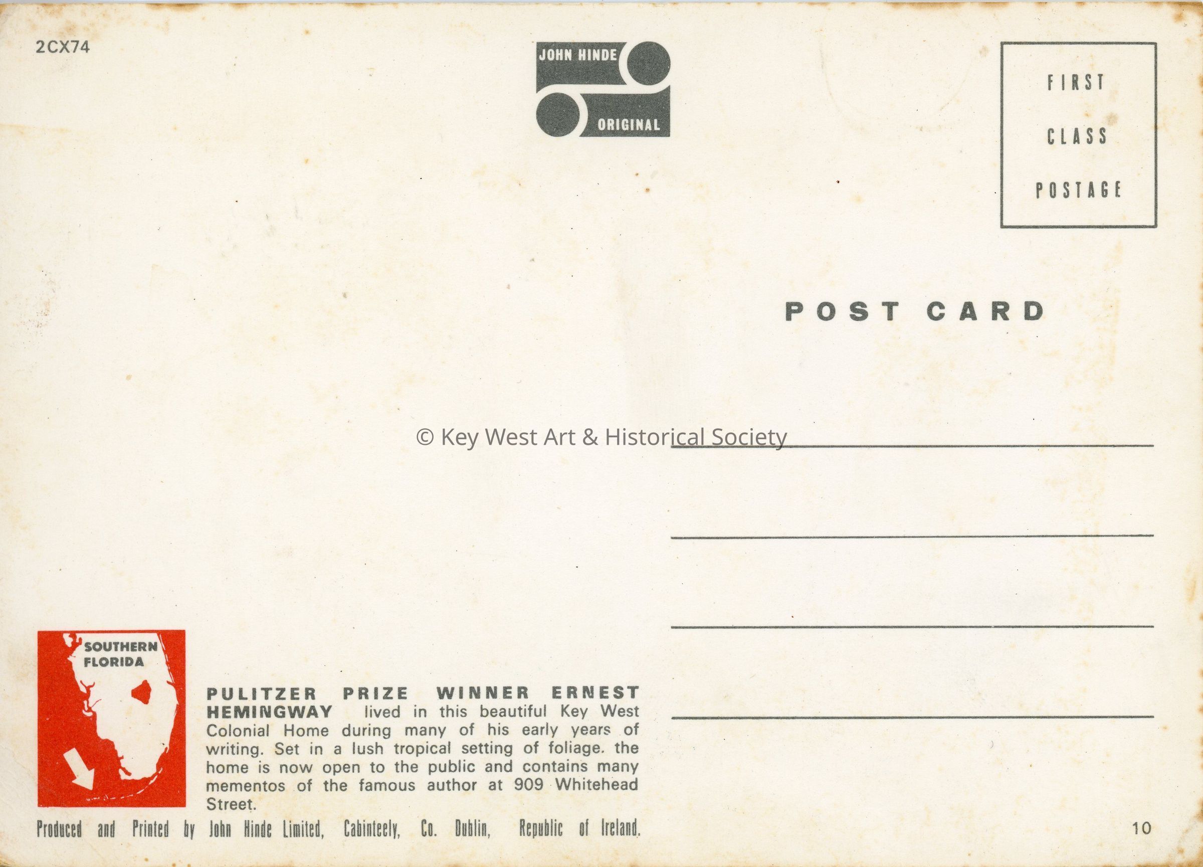 Postcard depicting the Ernest Hemingway Home and Museum with guests present. Notation on verso reads 'PULITZER PRIZE WINNER ERNEST HEMINGWAY lived in this beautiful Key West Colonial Home during many of his early years of writing. Set in a lush tropical setting of foliage. the home is now open to the public and contains many mementos of the famous author at 909 Whitehead Street.'Subject Place