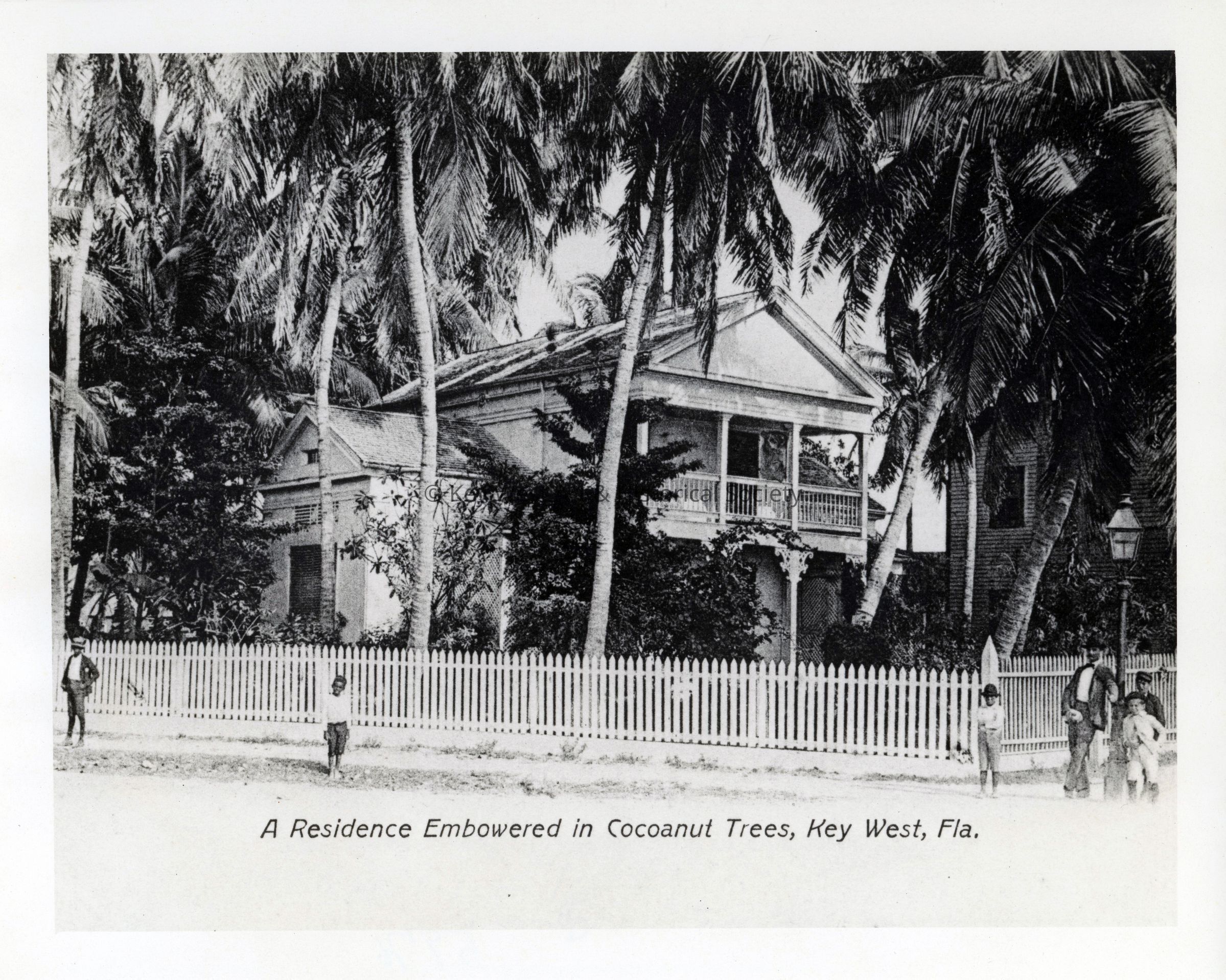 Black and white photograph of the Ferguson residence at 299 Front Street. The property was taken over by the U.S. Navy about 1900 and the house was relocated and converted for military use. Caption reads, 'A residence embowered in Cocoanut Trees, Key West, Fla.'Photograph Details