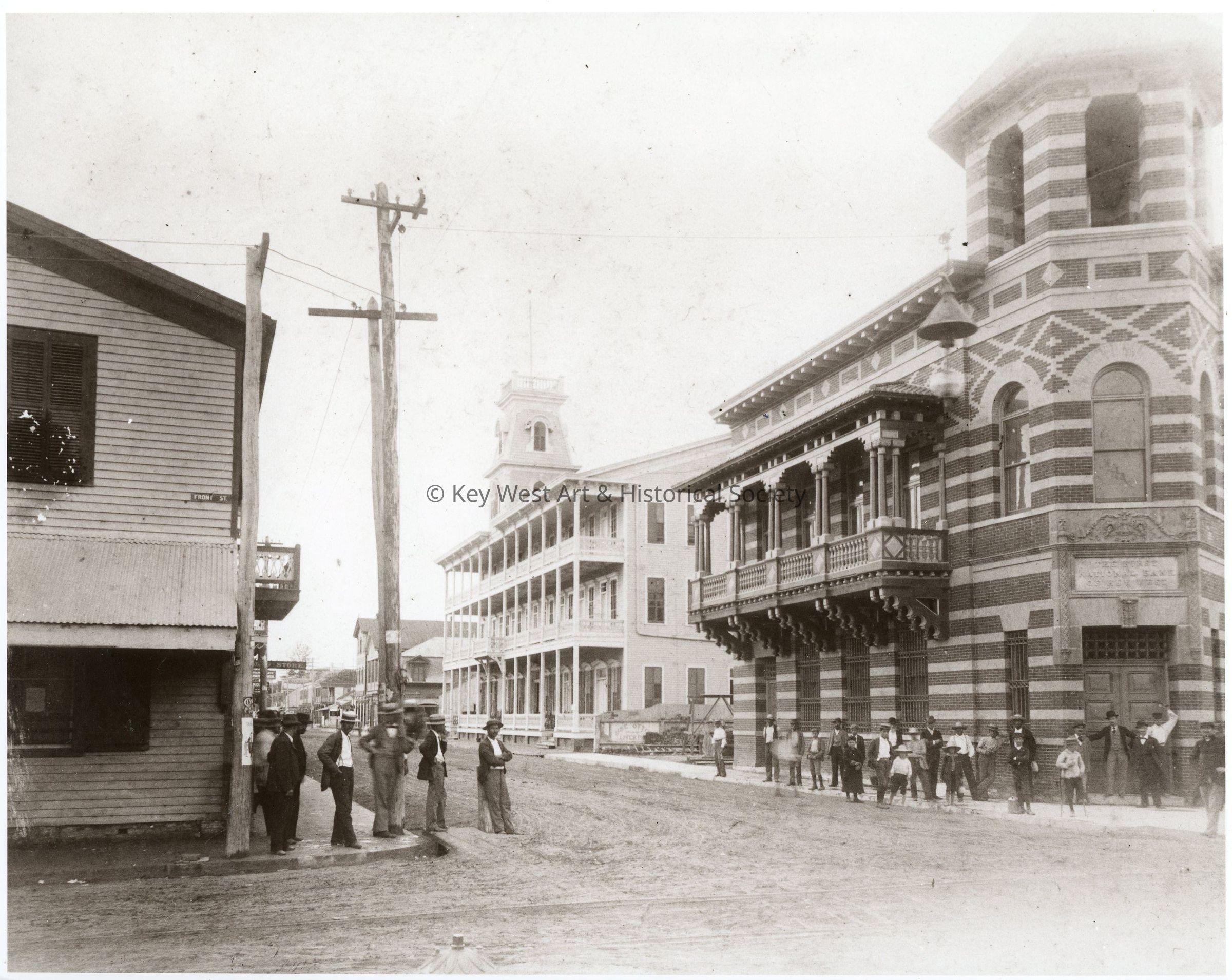 Black and white photograph of the First National Bank of Key West & The Jefferson Hotel located on the 100 block of Duval Street