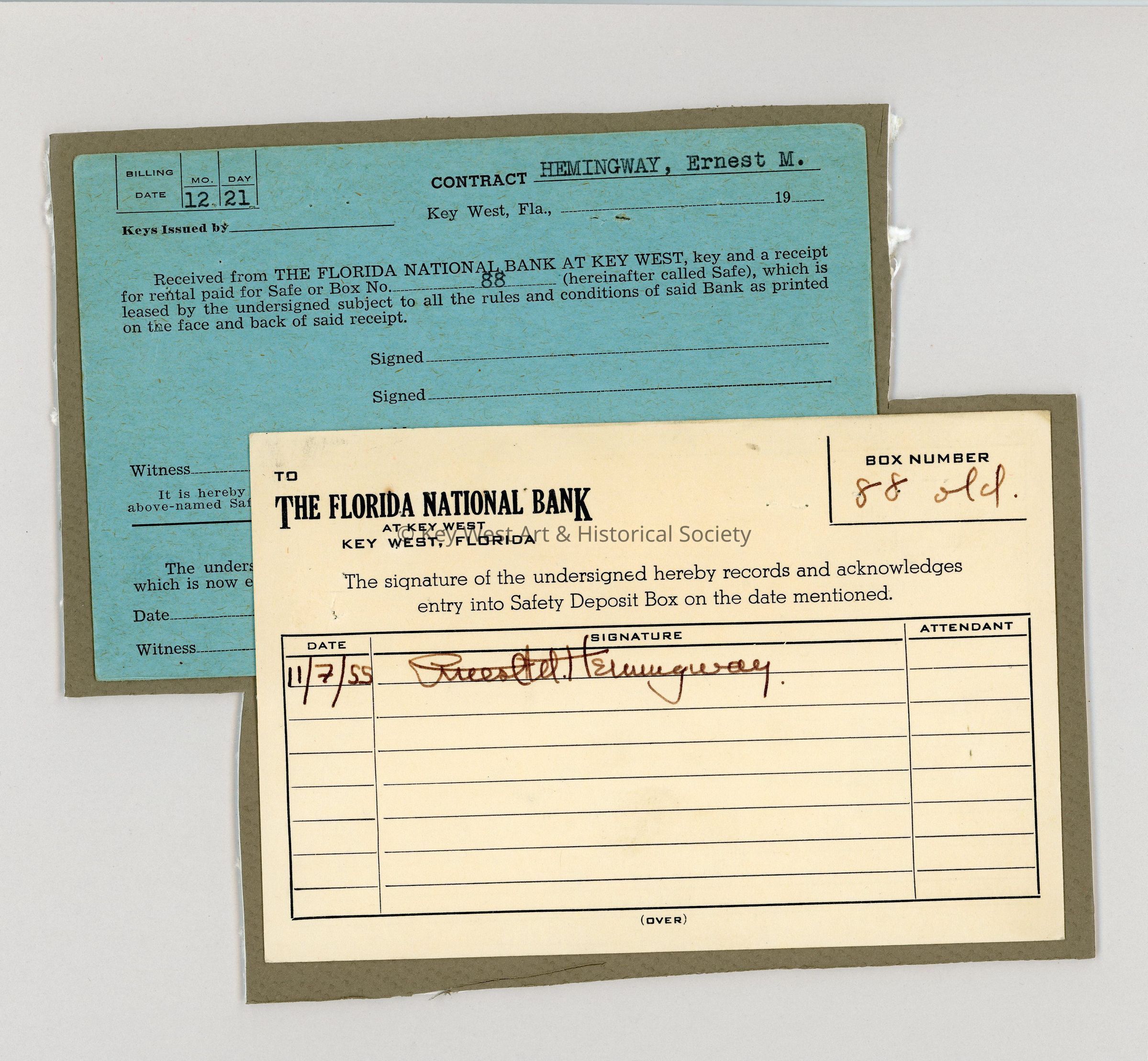 Two cards for Florida National Bank, one detailing access to Ernest Hemingway's safety deposit box and the other a blank form for leasing the safe. The cards have been stuck to board for display. The access card is dated November 1, 1955. The bank was previously located at 420 Front Street.Collection