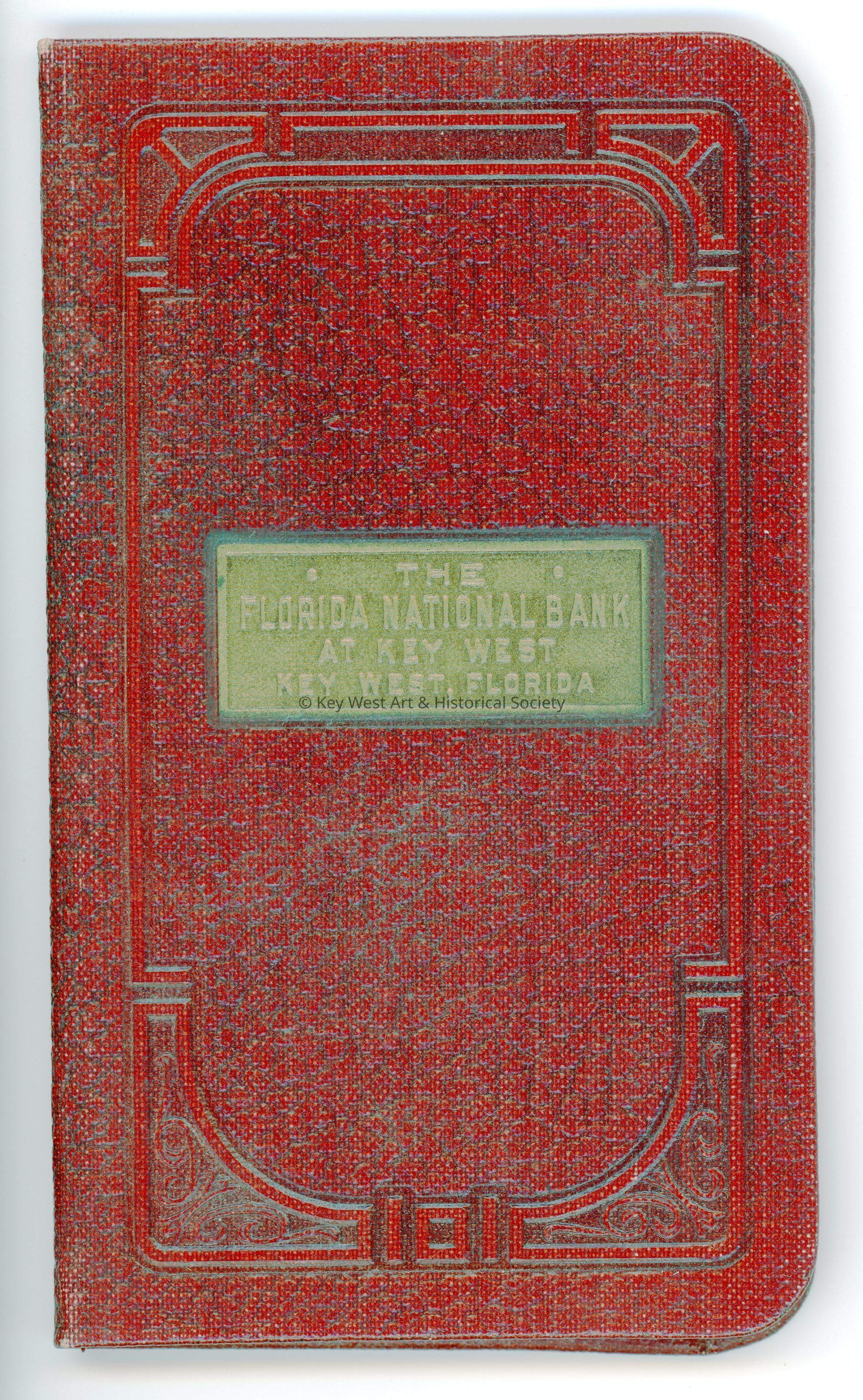 An account book for The Florida National Bank of Key West. Faux burgundy leather with a metal name plate in the center. The bank was formerly located at 420 Front Street.
