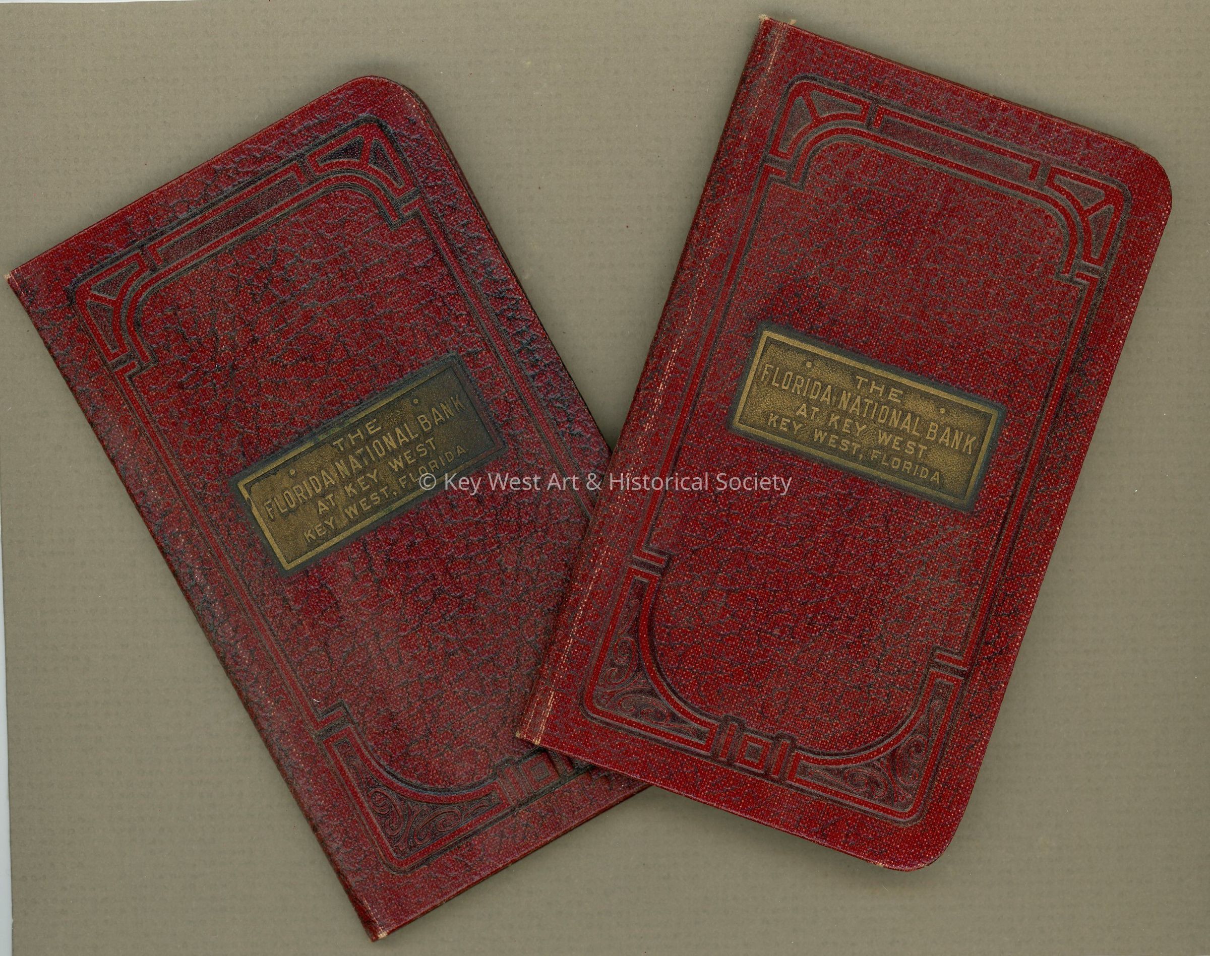 Two account books for The Florida National Bank of Key West. Faux leather with a metal name plate in the center. The bank was formerly located at 420 Front Street. The books were stuck to a board for display in Wachovia Bank (at the same location).